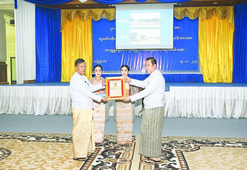 ပုဂံရှေးဟောင်းယဉ်ကျေးမှုအမွေအနှစ်ဒေသအတွင်း ရေကြီးရေလျှံမှုများ ထပ်မံမဖြစ်ပေါ်စေရေးနှင့် ရေစီးရေလာကောင်းမွန်စေရေးအတွက် ရေလမ်းကြောင်းများဖော်ထုတ်ခြင်းနှင့် ရှေးဟောင်းရေကန် (၉၁) ကန် ပြန်လည်တူးဖော်ထိန်းသိမ်းကန်ဆယ်ခြင်းလုပ်ငန်းများကို ဆောင်ရွက်နိုင်ရန်အတွက် ဝိုင်းဝန်းကူညီ ဆောင်ရွက်ပေးကြသည့် ဝန်ကြီးဌာနများနှင့် ရေကန်အလှူရှင်များအား ဂုဏ်ပြုမှတ်တမ်းလွှာပေးအပ်ပွဲအခမ်းအနားကို ယနေ့တွင် အမျိုးသားစာကြည့်တိုက် (နေပြည်တော်) ဝန်ဇင်းမင်းရာဇာခန်းမ၌ ကျင်းပသည်။