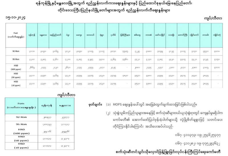 ရန်ကုန်မြို့နှင့် မန္တလေးမြို့အတွက် ရည်ညွှန်းလက်ကားဈေးနှုန်းများနှင့် ပြည်ထောင်စုနယ်မြေ နေပြည်တော်၊ တိုင်းဒေသကြီး/ပြည်နယ် မြို့တော်များအတွက် ရည်ညွှန်းလက်လီဈေးနှုန်းများ