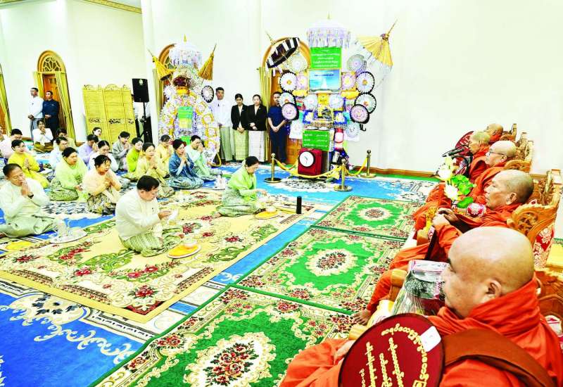 ပြည်ထောင်စုနယ်မြေနေပြည်တော် ဒက္ခိဏသီရိမြို့နယ် မာရဝိဇယဗုဒ္ဓဥယျာဉ်ဝတ္ထုကံတော်အတွင်းရှိ မာရဝိဇယကျောင်းတော် ၂၀၂၅ခုနှစ်ကထိန်သင်္ကန်းဆက်ကပ်လှူဒါန်းပွဲအခမ်းအနားကို ယနေ့နံနက်ပိုင်းတွင် အဆိုပါမာရဝိဇယကျောင်းတော်၌ကျင်းပပြုလုပ်ရာ ပြည်ထောင်စုသမ္မတမြန်မာနိုင်ငံတော်ယာယီသမ္မတ နိုင်ငံတော်လုံခြုံရေးနှင့်အေးချမ်းသာယာရေးကော်မရှင်ဥက္ကဋ္ဌ ဗိုလ်ချုပ်မှူးကြီး မင်းအောင်လှိုင်နှင့်ဇနီး ဒေါ်ကြူကြူလှတို့ တက်ရောက်၍ ကထိန်လျာသင်္ကန်းနှင့်လှူဖွယ်ပစ္စည်းများ ဆက်ကပ်လှူဒါန်းသည်။