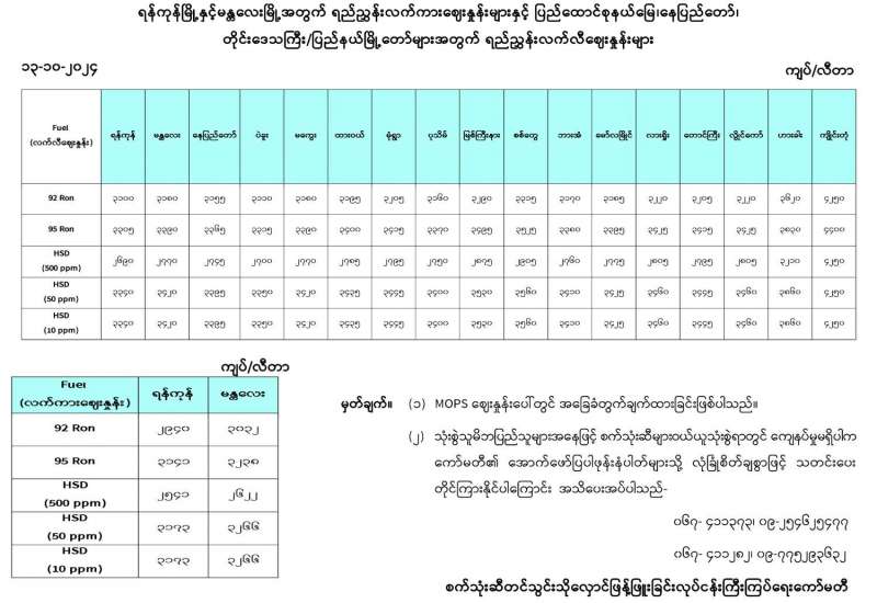စီးပွားရေးနှင့်ကူးသန်းရောင်းဝယ်ရေးဝန်ကြီးဌာန၊ စားသုံးဆီတင်သွင်း သိုလှောင်ဖြန့်ဖြူးခြင်းလုပ်ငန်း ကြီးကြပ်ရေးကော်မတီအနေဖြင့် စားအုန်းဆီကမ္ဘာ့ဈေးနှုန်း ဖြစ်ပေါ်ပြောင်းလဲမှုနှင့်အညီ ပြည်တွင်း၌ ဖြစ်သင့်ဖြစ်ထိုက်သည့် ဈေးနှုန်းများ ဖြစ်ပေါ်စေရေး ထိန်းကျောင်းဆောင်ရွက်လျက်ရှိပြီး စားအုန်းဆီ အဓိကထုတ်လုပ်တင်ပို့သည့် နိုင်ငံများတွင် ဖြစ်ပေါ်နေသည့် FOB ဈေးနှုန်းများကို နေ့စဉ်စောင့်ကြည့်ကာ သယ်ယူပို့ဆောင်ခကုန်ကျစရိတ်များ၊ ဘဏ်စရိတ်များ၊ အခွန်အခများ ထည့်သွင်းတွက်ချက်၍ ပြည်တွင်းဈေးကွက်၌ ရောင်းဝယ်ဖောက်ကားရမည့် အခြေခံလက်ကားရည်ညွှန်းဈေးနှုန်းကို ထုတ်ပြန် ပေးလျက်ရှိသည်။