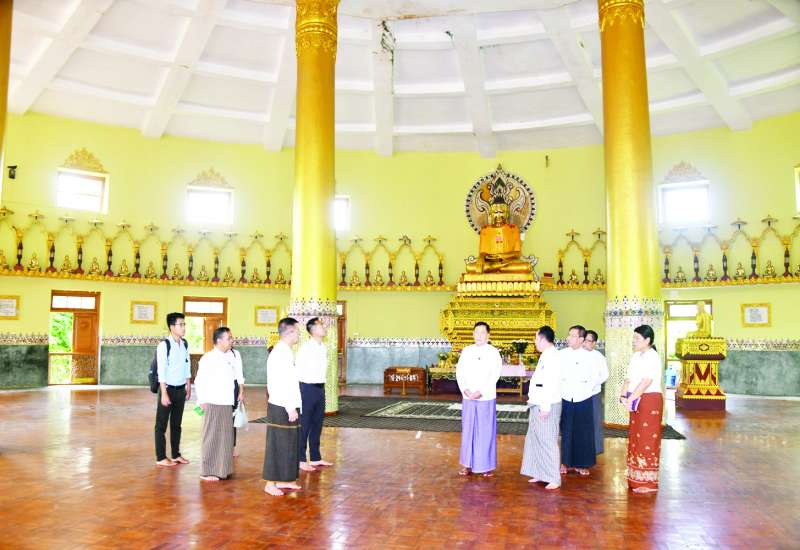 သာသနာရေးနှင့်ယဉ်ကျေးမှုဝန်ကြီးဌာန ဒုတိယဝန်ကြီး ဦးအေးထွန်းသည် တာဝန်ရှိသူများနှင့်အတူ ယနေ့နံနက်ပိုင်းက ရန်ကုန်တိုင်းဒေသကြီး ဗဟန်းမြို့နယ် ရွှေတောင်ကြား ၂ ရပ်ကွက် အင်းယားမြိုင်လမ်း အလယ်တောရစံပြစာသင်တိုက်အတွင်းရှိ တက်လမ်းဆောက်လုပ်ရေးကုမ္ပဏီမှ တာဝန်ယူဆောင်ရွက်သော နိုင်ငံတော်သံဃမဟာနာယကအဖွဲ့ပိုင်အဖြစ် ဗုဒ္ဓဘာသာဝင် ခုနစ်ရက်သားသမီးများ စုပေါင်းလှူဒါန်းထားသည့် ဓမ္မဝိဇယသာသနာ့ဗိမာန်တော်ကြီး RC လေးထပ်အဆောက်အအုံ ဆောက်လုပ်ပြီးစီးမှုကို ကြည့်ရှုစစ်ဆေးသည်။