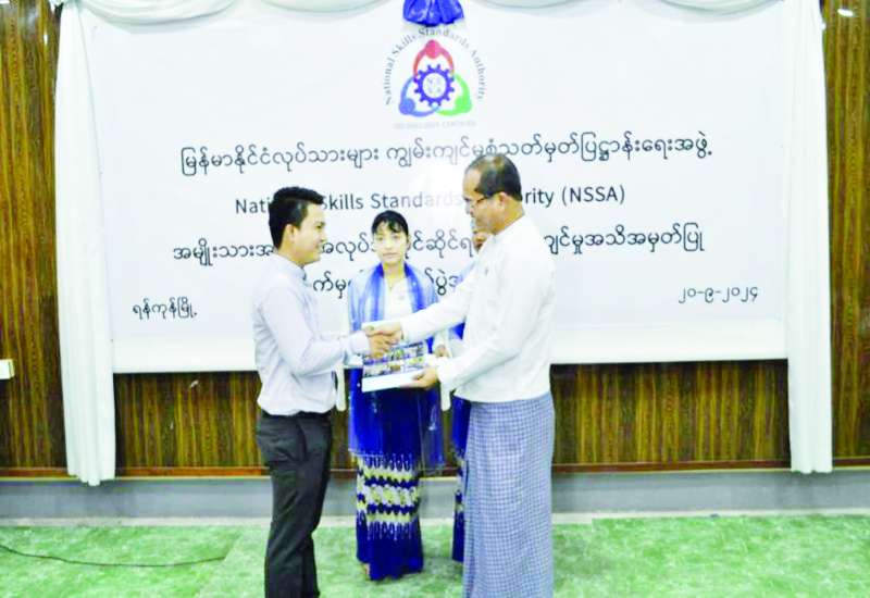 မြန်မာနိုင်ငံလုပ်သားများကျွမ်းကျင်မှု “စံ” သတ်မှတ်ပြဋ္ဌာန်းရေးအဖွဲ့(NSSA)၏ အမျိုးသားအဆင့် အလုပ်အကိုင်ဆိုင်ရာ ကျွမ်းကျင်မှုအသိအမှတ်ပြု လက်မှတ်ပေးအပ်ပွဲ အခမ်းအနားကို ယနေ့နံနက်ပိုင်းတွင် ရန်ကုန်တိုင်းဒေသကြီး ကျွမ်းကျင်မှုလေ့ကျင့်ရေး သင်တန်းကျောင်း (ရန်ကင်း)၌ ကျင်းပသည်။