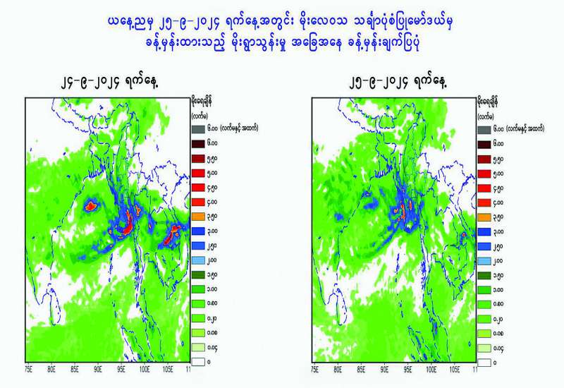 မိုးလေဝသနှင့် ဇလဗေဒညွှန်ကြားမှုဦးစီးဌာနမှ ယနေ့ ညနေ (၅) နာရီခွဲအချိန် တိုင်းထွာချက်များအရ ထိုင်းနိုင်ငံ ကုန်းတွင်းပိုင်းဒေသများနှင့် မြန်မာနိုင်ငံ၊ ကရင်ပြည်နယ်၊ မွန်ပြည်နယ်နှင့် ကယားပြည်နယ်တို့တွင် ဖြစ်ပေါ်နေသော လေဖိအားနည်းဆဲလ်သည် ကပ္ပလီပင်လယ်ပြင်မြောက်ပိုင်းနှင့် ယင်းနှင့်ဆက်စပ်လျက်ရှိသော မြန်မာနိုင်ငံ၊ မွန်ပြည်နယ်၊ ပဲခူးတိုင်းဒေသကြီး၊ ရန်ကုန်တိုင်းဒေသကြီးနှင့် ဧရာဝတီတိုင်းဒေသကြီးတို့ကို ဖြတ်ကျော်လျက်ရှိပါသည်။ ထို့နောက် အနောက်ဘက်သို့ ဆက်လက်ရွေ့လျားနိုင်ကာ၊ စက်တင်ဘာလ (၂၃) ရက် (အခုလ-၂၃) ရက်နေ့တွင် ဘင်္ဂလားပင်လယ်အော်အလယ်ပိုင်း၌ လေဖိအားနည်းရပ်ဝန်းအဖြစ် ရောက်ရှိနိုင်သည်ဟု ခန့်မှန်းရပါသည်။