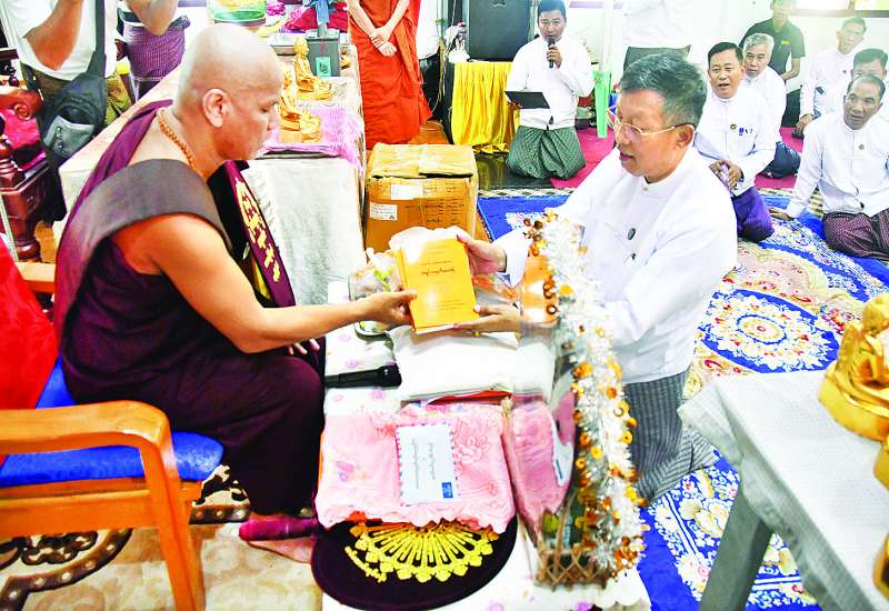 နေပြည်တော်ကောင်စီနယ်မြေ ဇေယျာသီရိမြို့နယ် ရတနာစံကျောင်းတိုက်၌ ရေဘေးရှောင်နေသော ဘုန်းတော်ကြီးကျောင်းများ၊ ဘုန်းတော်ကြီးသင်ပညာရေးကျောင်းနှင့် သီလရှင်ကျောင်းများမှ ဆရာတော် သံဃာတော်များနှင့် သီလရှင်များအား သင်္ကန်းနှင့်လှူဖွယ်ဝတ္ထုများ ဆက်ကပ်လှူဒါန်းခြင်းအခမ်းအနားကို ယနေ့နံနက် ၈ နာရီက ရတနာစံပရိယတ္တိစာသင်တိုက် ရတနာဘိမတဓမ္မဗိမာန်တော်၌ ကျင်းပပြုလုပ်ရာ သာသနာရေးနှင့်ယဉ်ကျေးမှုဝန်ကြီးဌာန ပြည်ထောင်စုဝန်ကြီး ဦးတင်ဦးလွင်၊ ဒုတိယဝန်ကြီးများ၊ အမြဲတမ်းအတွင်းဝန်၊ ညွှန်ကြားရေးမှူးချုပ်များနှင့် တာဝန်ရှိသူများ တက်ရောက်ကြသည်။