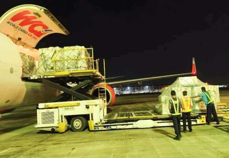 The ASEAN Coordinating Centre for Humanitarian Assistance on Disaster Management (AHA Centre) မှ ရေဘေးသင့်ဒေသများအတွက်လှူဒါန်းသည့် ကယ်ဆယ်ရေးပစ္စည်းများသည် ထိုင်းနိုင်ငံ Disaster Emergency Logistics System for ASEAN (DELSA) Warehouse မှတစ်ဆင့် မြန်မာအမျိုးသားလေကြောင်းလိုင်း MNA UB-2020 လေယာဉ်ဖြင့် ယမန်နေ့နံနက် ၁ နာရီတွင် ရန်ကုန်အပြည်ပြည်ဆိုင်ရာလေဆိပ်သို့ ရောက်ရှိသည်။
