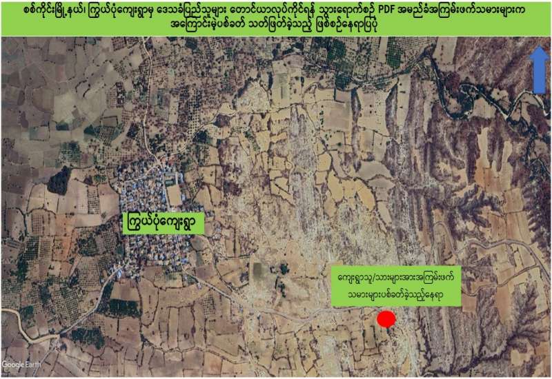စစ်ကိုင်းတိုင်းဒေသကြီး၊ စစ်ကိုင်းမြို့နယ်၊ ကြွယ်ပုံကျေးရွာရှိ တောင်သူများသည် တောင်ယာလုပ်ငန်းလုပ်ကိုင်ရန်အတွက် သွားရောက်စဉ် PDF အမည်ခံအကြမ်းဖက်သမားများက လက်နက်ကြီး/လက်နက်ငယ်များဖြင့် အကြောင်းမဲ့ဝိုင်းဝန်းပစ်ခတ်ခဲ့သဖြင့် ဒေသခံပြည်သူအမျိုးသမီး ၁၂ ဦးသေဆုံးပြီး ၃ ဦး ထိခိုက်ဒဏ်ရာရရှိခဲ့ကြောင်း သိရှိရသည်။