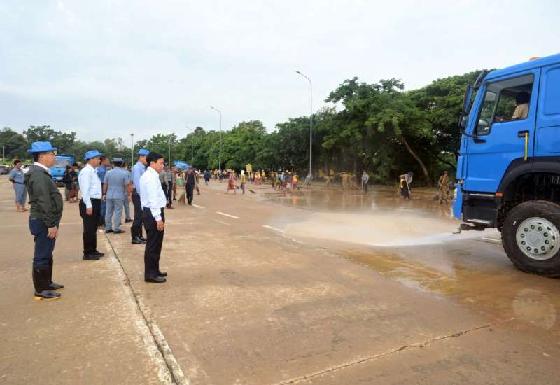 နေပြည်တော်ကောင်စီဥက္ကဋ္ဌ၊ မြို့တော်ဝန် ဦးသန်းထွန်းဦးသည် နေပြည်တော်စည်ပင်သာ ယာရေးကော်မတီ ဒုတိယမြို့တော်ဝန် ဦးမောင်မောင်နှင့် သက်ဆိုင်ရာတာဝန်ရှိသူများနှင့်အတူ ယမန်နေ့ နံနက်ပိုင်းက ပုဗ္ဗသီရိမြို့နယ်၊ အေးမြင့်သာယာတံတားနှင့် ပင်လောင်းလမ်းတစ်လျှောက် မိုးသည်း ထန်စွာရွာသွန်း၍ ရေကြီး ရေလျှံမှုကြောင့် တင်ကျန်နေသည့် နုန်းမြေများ၊ သစ်တုံး/သစ်ကိုင်းများနှင့် အမှိုက်သရိုက်များအား ဌာနဆိုင်ရာမှဝန်ထမ်းများ၊ တပ်မတော်သားများ၊ နေပြည်တော်စည်ပင် သာယာရေးကော်မတီမှ ဝန်ထမ်းများ၊ လုပ်သားများ၊ စက်ယန္တရားများဖြင့် ဖယ်ရှားရှင်းလင်းခြင်း လုပ်ငန်း ဆောင်ရွက်နေမှုအခြေအနေများကို လိုက်လံကြည့်ရှုစစ်ဆေးပြီး လိုအပ်သည်များကို တာဝန်ရှိသူများအား မှာကြားသည်။