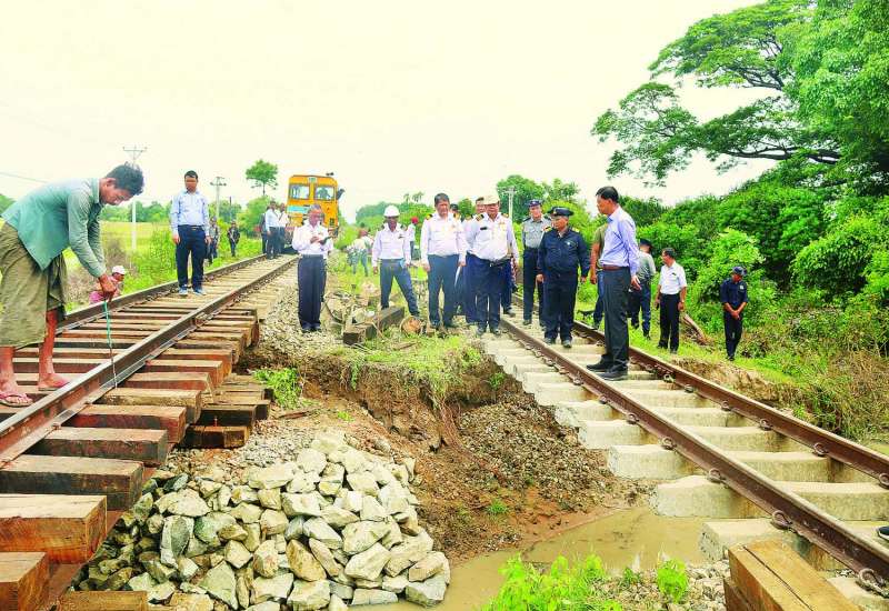နိုင်ငံတော်စီမံအုပ်ချုပ်ရေးကောင်စီအဖွဲ့ဝင် ဒုတိယဝန်ကြီးချုပ်နှင့် ပို့ဆောင်ရေးနှင့်ဆက်သွယ်ရေးဝန်ကြီးဌာန ပြည်ထောင်စုဝန်ကြီးဗိုလ်ချုပ်ကြီးမြထွန်းဦးသည် ဝန်ကြီးဌာနနှင့် မြန်မာ့မီးရထားမှ တာဝန်ရှိသူများနှင့်အတူယနေ့နံနက်ပိုင်းတွင် မြန်မာ့မီးရထား တိုင်းအမှတ် (၅)၊ မန္တလေးတိုင်းဒေသကြီး ရမည်းသင်းမြို့နယ်နှင့် ပျော်ဘွယ်မြို့နယ်အတွင်းရှိ ရန်ကုန်-မန္တလေး ရထားလမ်းတစ်လျှောက်မကြာမီက မိုးသည်းထန်စွာရွာသွန်းခဲ့မှုကြောင့် ရေတိုက်စားပြီး ပျက်စီးချို့ယွင်းမှုအခြေအနေနှင့် အဆိုပါပျက်စီးချို့ယွင်းသည့် နေရာများအား မြန်မာ့မီးရထားဝန်ထမ်းများက မွမ်းမံပြင်ဆင်ဆောင်ရွက်နေမှုအခြေအနေကို လိုက်လံကြည့်ရှုစစ်ဆေးသည်။