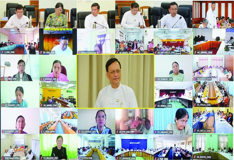 ပညာရေးဝန်ကြီးဌာန ဒုတိယဝန်ကြီး ဒေါက်တာဇော်မြင့်နှင့် တက္ကသိုလ်၊ ဒီဂရီကောလိပ်များ၏ ပါမောက္ခချုပ်များ၊ ကျောင်းအုပ်ကြီးများ၊ ဒုတိယပါမောက္ခချုပ်များ၊ ပါမောက္ခများ ညှိနှိုင်းအစည်းအဝေးကို ယနေ့မွန်းလွဲပိုင်းတွင် နေပြည်တော်ပညာရေးဝန်ကြီးဌာန ရုံးအမှတ် (၁၃) ရှိ အစည်းအဝေးခန်းမ၌ ကျင်းပရာ အဆင့်မြင့်ပညာဦးစီးဌာန၊ ဆရာအတတ်ပညာဦးစီးဌာန၊ ကျောင်းပြင်ပနှင့် တစ်သက်တာပညာရေးဦးစီးဌာနတို့မှ ညွှန်ကြားရေးမှူးချုပ်များ၊ ဒုတိယအမြဲတမ်းအတွင်းဝန်များ တက်ရောက်ကြပြီး တက္ကသိုလ်၊ ဒီဂရီကောလိပ်များမှ ပါမောက္ခချုပ်များ၊ ကျောင်းအုပ်ကြီးများ၊ ဒုတိယပါမောက္ခချုပ်များနှင့် ပါမောက္ခ၊ ဌာနမှူးများက Online ဖြင့် တက်ရောက်ကြသည်။