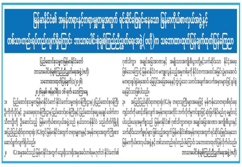 ဂမ်ဘီယာနိုင်ငံ၏ စွပ်စွဲချက်များကို မြန်မာနိုင်ငံက စာဖြင့်ရေးသားတုံ့ပြန်ထားပါကြောင်း၊ ယခု ICJ ၌ အမှုစစ်ဆေးခြင်းသည် ပြစ်မှုကြောင်းစစ်ဆေးခြင်းမဟုတ်ကြောင်း၊ ICJ သည် မြန်မာနိုင်ငံ အနေဖြင့် အပြည်ပြည်ဆိုင်ရာကွန်ဗင်းရှင်းအရ ဆောင်ရွက်ပေးရမည့် အပြည်ပြည်ဆိုင်ရာ တာဝန်ရှိမှုနှင့်စပ်လျဉ်း၍ နိုင်ငံအချင်းချင်းအကြား အငြင်းပွားမှုများကို ဖြေရှင်းသည့် တရားရုံးဖြစ်ကြောင်း၊ ယခုအမှု၏ သဘောသဘာဝနှင့်စပ်လျဉ်း၍ တရားရုံးရှေ့မှာ သက်သေပြရမည့် တာဝန်သည် တော်တော်လေးမြင့်မားပါကြောင်း၊ သက်သေပြရမည့် တာဝန်နှင့်စပ်လျဉ်း၍ အပြည်ပြည်ဆိုင်ရာ ပြစ်မှုတရားရုံးနှင့် ပြည်တွင်းတရားရုံးများကဲ့သို့ သံသယကင်းရှင်းသည်အထိ သက်သေပြရန်တာဝန်ရှိကြောင်း၊ ယခုအမှုသည် တိုက်ရိုက်ထိခိုက် နစ်နာခြင်းမရှိသည့် နိုင်ငံတစ်ခုက Genocide Convention ကို လိုက်နာရန်အတွက် ကွန်ဗင်းရှင်းဝင်နိုင်ငံများအားလုံး၏ အကျိုးကိုယ်စားဆိုကာ အခြားနိုင်ငံတစ်ခုကို အမှုစွဲဆိုသည့် ပထမဦးဆုံးသောအမှုဖြစ်ကြောင်း၊ မြန်မာနိုင်ငံအနေဖြင့် ဂမ်ဘီယာက အများအကျိုးအတွက်ဟု စွဲဆိုသည့် Genocide Convention တွင် အဖွဲ့ဝင်နိုင်ငံအဖြစ် ပါဝင်နေကြောင်း၊ အများအကျိုးဆိုသည်မှာ Convention ၏ တာဝန်များကို နိုင်ငံများကလိုက်နာစေရန် ဆောင်ရွက်ခြင်းဖြစ်ကြောင်း၊ Genocide ဟု အမည်တပ်ပြီး စွပ်စွဲသမျှကို နိုင်ငံများက ဖြေရှင်းရန် မဟုတ်ကြောင်း၊ ယခုအမှုမတိုင်မီကတည်းက စွဲဆိုသည့်နိုင်ငံများအနေဖြင့် အခြားအဖွဲ့ဝင်နိုင်ငံများကိုယ်စား စွဲဆိုနိုင်ခြင်း ရှိ မရှိ သို့မဟုတ် Convention ကိုလိုက်နာရန် တာဝန်နှင့် စပ်လျဉ်း၍ စောင့်ကြည့်ရန်တာဝန်ရှိ မရှိတို့နှင့်စပ်လျဉ်း၍ ဆုံးဖြတ်သည့် ယန္တရားမရှိကြောင်း၊ ဆုံးဖြတ်ဆောင်ရွက်ပေးရမည့်ယန္တရားကို ICJ တရားရုံးက ယူခဲ့ရာ ICJ တရားရုံးအနေဖြင့် ဂရုတစိုက်စစ်ဆေးရန် တာဝန်ရှိကြောင်း၊ မည်သည့်တရားရုံးမဆို ဘက်လိုက်မှု ကင်းရှင်းစွာဖြင့် တိတိကျကျဆောင်ရွက်ရမည်ဖြစ်ပါကြောင်း၊ စွဲဆိုသည့်နိုင်ငံအနေဖြင့်လည်း စွဲဆိုသည့်အချက်အလက် အထောက်အထားများ တိကျမှန်ကန်မှုရှိရန် လိုအပ်သည်ဆိုသည့်အကြောင်း ပြောကြားခဲ့ပါသည်။
