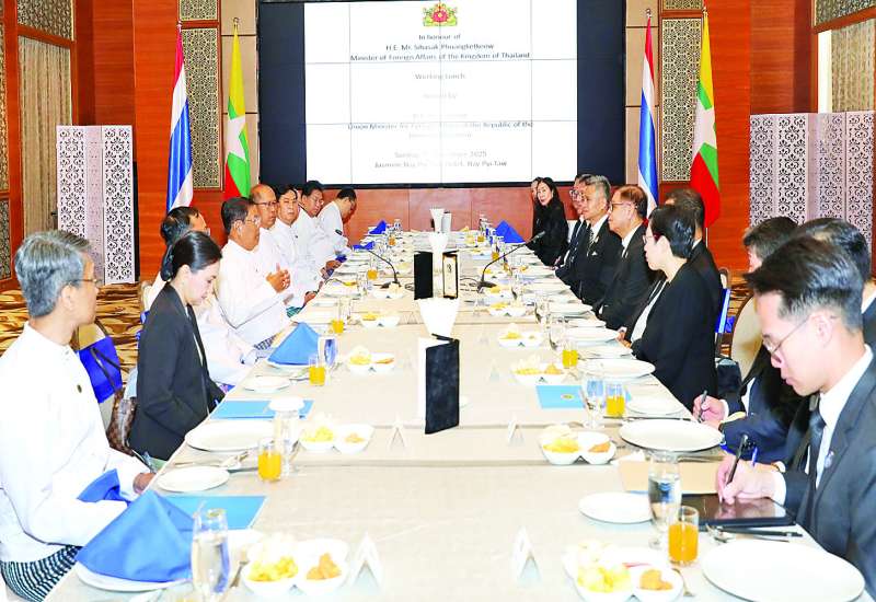 နိုင်ငံခြားရေးဝန်ကြီးဌာန ပြည်ထောင်စုဝန်ကြီး ဦးသန်းဆွေသည် ယနေ့တွင် နေပြည်တော်သို့ နေ့ချင်းပြန်ခရီးလာရောက်ခဲ့သည့် ထိုင်းနိုင်ငံခြားရေးဝန်ကြီး H.E. Mr. Sihasak Phuangketkeow နှင့် တွေ့ဆုံဆွေးနွေးပြီး ၎င်းနှင့်ကိုယ်စားလှယ်အဖွဲ့အား Jasmine Nay Pyi Taw Hotel ၌ အလုပ်သဘော နေ့လယ်စာဖြင့် တည်ခင်းဧည့်ခံသည်။