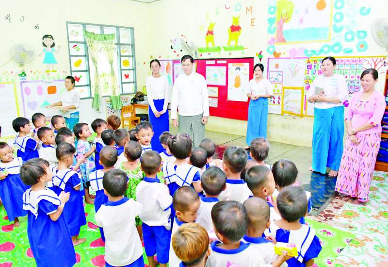 လူမှုဝန်ထမ်း၊ ကယ်ဆယ်ရေးနှင့် ပြန်လည်နေရာချထားရေးဝန်ကြီးဌာန ဒုတိယဝန်ကြီး ဦးစိုးကြည်သည် တာဝန်ရှိသူများနှင့်အတူ ယနေ့မွန်းလွဲပိုင်းတွင် ပြည်ထောင်စုနယ်မြေ နေပြည်တော်အတွင်းရှိ သီရိရတနာမူလတန်းကြိုကျောင်းသို့ သွားရောက်၍ ရင်သွေးငယ်လေးများ၏ ဘက်စုံဖွံ့ဖြိုးတိုးတက်ရေးအတွက် သင်ကြားလေ့ကျင့်ပေးနေမှုကို ကြည့်ရှုစစ်ဆေးသည်။