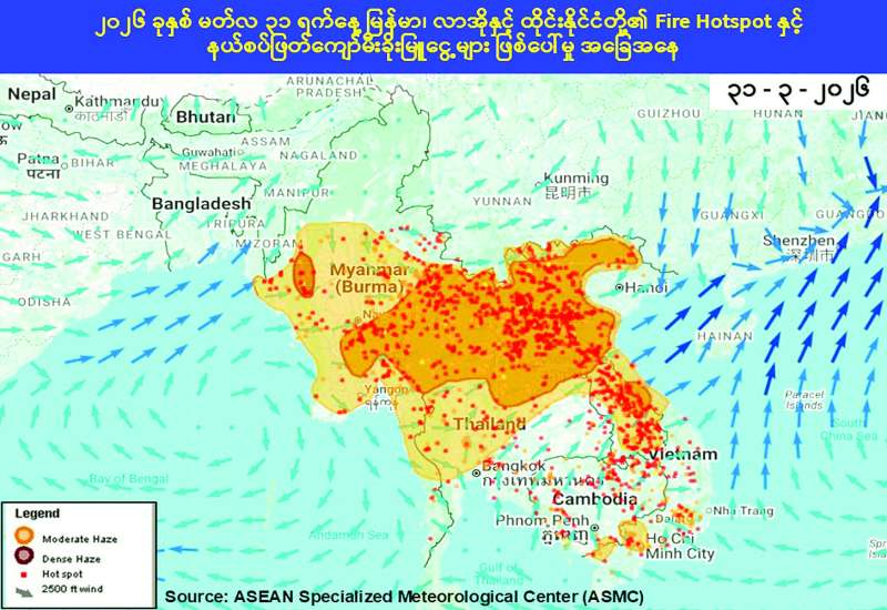 ၁။ နယ်စပ်ဖြတ်ကျော်မီးခိုးမြူငွေ့ ဖြစ်ပေါ်နိုင်သည့် အခြေအနေများနှင့် စပ်လျဉ်း၍ စင်ကာပူနိုင်ငံအခြေစိုက် အာဆီယံမိုးလေဝသစောင့်ကြည့်လေ့လာရေးဗဟိုဌာန (ASEAN Specialized Meteoro-logical Center - ASMC) မှ ထုတ်ပြန်ချက်များအရ-