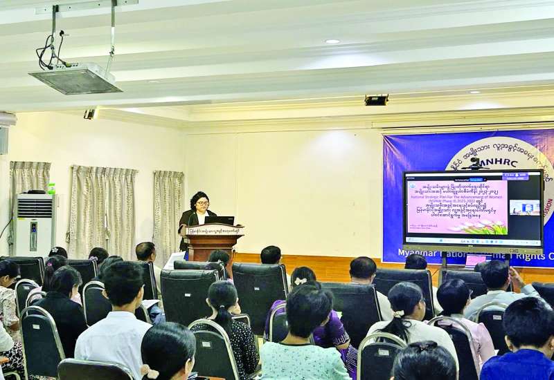 မြန်မာနိုင်ငံ အမျိုးသားလူ့အခွင့်အရေးကော်မရှင်သည် ၂၀၂၄ ခုနှစ် မတ် ၈ ရက်တွင် ကျရောက်မည့် အပြည်ပြည်ဆိုင်ရာ အမျိုးသမီးများနေ့ကို ဂုဏ်ပြုကြိုဆိုသောအားဖြင့် အပြည်ပြည်ဆိုင်ရာအမျိုးသမီးများနေ့အထိမ်းအမှတ် အကြိုဟောပြောပွဲကို ယနေ့မွန်းလွဲပိုင်းတွင် မြန်မာနိုင်ငံအမျိုးသား လူ့အခွင့်အရေးကော်မရှင်ရုံး Conference Room ၌ Hybrid System ဖြင့် ကျင်းပသည်။