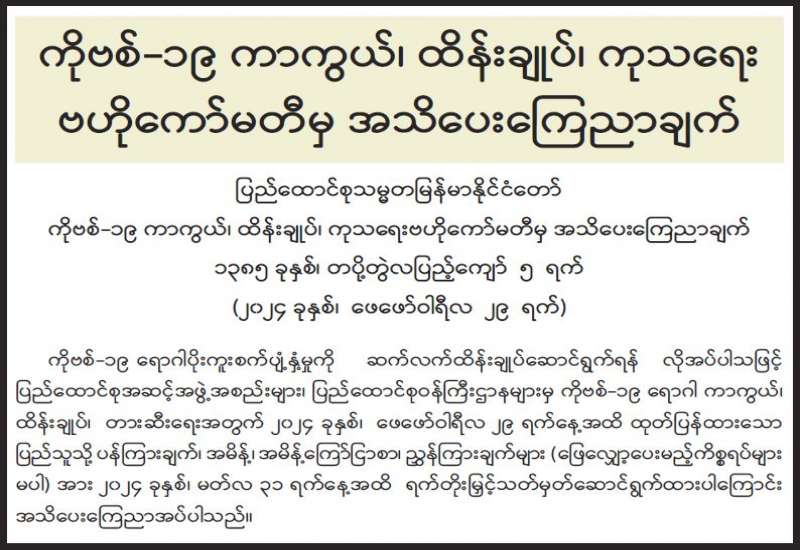 ကိုဗစ်-၁၉ ရောဂါပိုးကူးစက်ပျံ့နှံ့မှုကို ဆက်လက်ထိန်းချုပ်ဆောင်ရွက်ရန် လိုအပ်ပါသဖြင့် ပြည်ထောင်စုအဆင့်အဖွဲ့အစည်းများ၊ ပြည်ထောင်စုဝန်ကြီးဌာနများမှ ကိုဗစ်-၁၉ ရောဂါ ကာကွယ်၊ ထိန်းချုပ်၊ တားဆီးရေးအတွက် ၂၀၂၄ ခုနှစ်၊ ဖေဖော်ဝါရီလ ၂၉ ရက်နေ့အထိ ထုတ်ပြန်ထားသော ပြည်သူသို့ပန်ကြားချက်၊ အမိန့်၊ အမိန့်ကြော်ငြာစာ၊ ညွှန်ကြားချက်များ (ဖြေလျှော့ပေးမည့်ကိစ္စရပ်များမပါ)အား ၂၀၂၄ ခုနှစ်၊ မတ်လ ၃၁ ရက်နေ့အထိ ရက်တိုးမြှင့်သတ်မှတ်ဆောင်ရွက်ထားပါကြောင်း အသိပေးကြေညာအပ်ပါသည်။