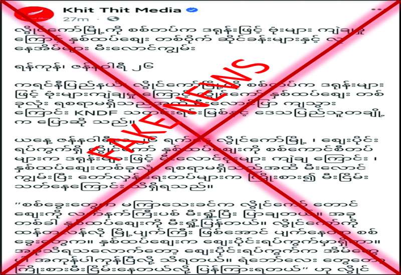 မွန်ပြည်နယ်၊ ကျိုက်မရောမြို့နယ်၊ ချောင်းနှစ်ခွနယ်မြေ ရဲစခန်းပတ်ဝန်းကျင်ရှိ နေအိမ်များကို တပ်မတော်မှ မီးရှို့ဖျက်ဆီးမှုများ လုပ်ဆောင်လျက်ရှိကြောင်း သတင်းတု၊ သတင်းမှားများကို တရားမဝင်ပြည်ဖျက်မီဒီယာများမှ လူမှုကွန်ရက်ပေါ်တွင် မဟုတ်မမှန်ရေး သားဖြန့်ဝေနေသည်ကို တွေ့ရှိရသည်။