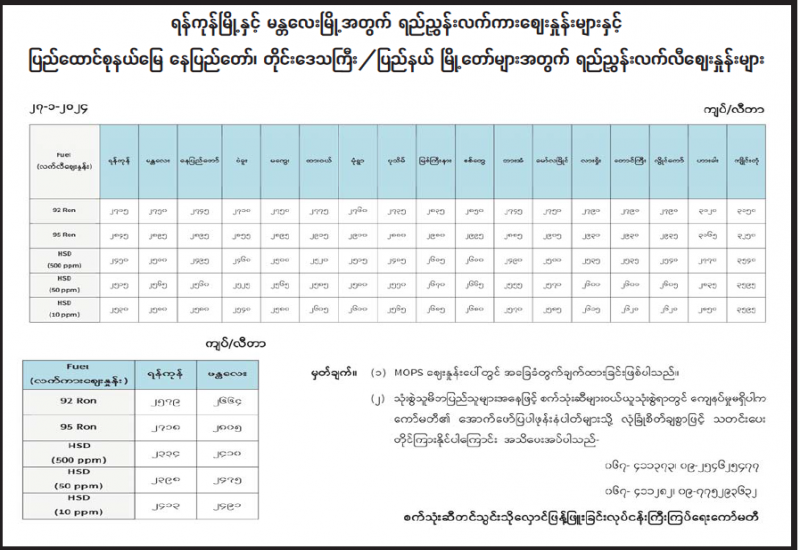 ရန်ကုန်မြို့နှင့် မန္တလေးမြို့အတွက် ရည်ညွှန်းလက်ကားဈေးနှုန်းများနှင့် ပြည်ထောင်စုနယ်မြေ နေပြည်တော်၊ တိုင်းဒေသကြီး/ပြည်နယ် မြို့တော်များအတွက် ရည်ညွှန်းလက်လီဈေးနှုန်းများ