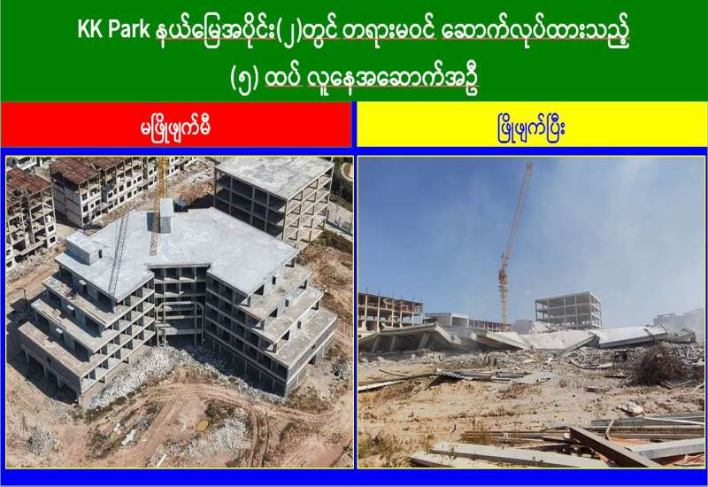 မြန်မာနိုင်ငံအစိုးရအနေဖြင့် အွန်လိုင်းလိမ်လည်လောင်းကစားမှုများ အများဆုံးအခြေချလုပ်ကိုင်လျက်ရှိကြသည့် ရွှေကုက္ကိုလ်နယ်မြေနှင့် KK Park နယ်မြေများရှိ တရားမဝင်အဆောက်အအုံများအတွင်း ဝင်ရောက်ရှင်းလင်း၍ အွန်လိုင်းလိမ်လည်လောင်းကစားမှုလုပ်ငန်းစဉ်များတွင် အသုံးပြုခဲ့သည့် သိမ်းဆည်းရမိပစ္စည်းများအား စနစ်တကျဖျက်ဆီးခြင်းနှင့် တရားမဝင်အဆောက်အအုံများအား စနစ်တကျဖြိုချဖျက်ဆီးခြင်းများကို အဖွဲ့စုံပါဝင်သည့် ပူးပေါင်းအဖွဲ့ဖြင့် ဆောင်ရွက်လျက်ရှိရာ ယနေ့တွင်လည်း KK Park နယ်မြေအတွင်းရှိ တရားမဝင်အဆောက်အအုံ ၂ လုံးကို ထပ်မံဖြိုချဖျက်ဆီးခဲ့ကြောင်း သိရှိရသည်။