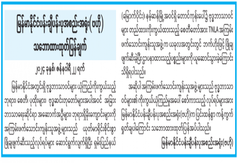 တိုင်းဒေသကြီးနှင့် ပြည်နယ်အချို့ရှိ ဘုရား၊ စေတီ၊ ပုထိုးများ၊ ဗုဒ္ဓဆင်းတုတော်များအပါအဝင် ဘာသာရေးဆိုင်ရာ အဆောက်အဦများကို လက်နက်ကိုင်အကြမ်းဖက်သောင်းကျန်းသူများက ဗုံးများ၊ လက်နက်ကြီးများဖြင့် ပစ်ခတ်ခြင်းနှင့် ဖြိုချဖျက်ဆီးခြင်း အပါအဝင် အကြမ်းဖက်လုပ်ရပ်ပေါင်းစုံကိုပြုလုပ်လျက်ရှိကြောင်းနှင့် TNLA အကြမ်းဖက်သောင်းကျန်းသူများက ဇန်နဝါရီလ ၁၀ ရက်မှ ၂၀ရက် အထိ ရှမ်းပြည်နယ်(မြောက်ပိုင်း)၊ နမ့်ဆန်မြို့အဝင်ရှိ တောင်ကုန်း ပေါ်၌ ဗုဒ္ဓဘာသာဝင်များ တည်ထားကိုးကွယ်ထားသည့် စေတီတော်အား ဘက်ဟိုးဖြင့် ဖြိုချဖျက်ဆီးခဲ့ပြီး ဌာပနာထားသည့် ပစ္စည်းများကို ယူဆောင်ခဲ့သည်ကို မြန်မာနိုင်ငံဟာသပညာရှင်များ အစည်းအရုံးက လုံးဝလက်မခံနိုင်ပါကြောင်းနှင့် ပြင်းထန်စွာ ကန့်ကွက်ရှုတ်ချပါကြောင်း သဘောထားထုတ်ပြန်ကြေညာအပ်ပါသည်။