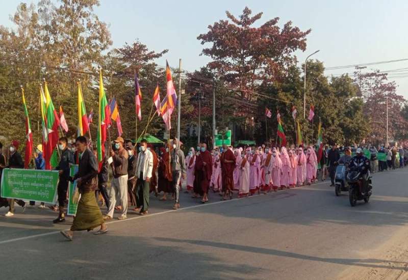 အကြမ်းဖက်သောင်းကျန်းသူများက ဘုရားစေတီပုထိုးများ၊ ဗုဒ္ဓဆင်းတုတော်များနှင့် ဘာသာရေးဆိုင်ရာ အဆောက်အဦများအား ဖျက်ဆီးစော်ကားမှုအပေါ် ကန့်ကွက်ရှုတ်ချပွဲများကို တိုင်းဒေသကြီးနှင့် ပြည်နယ်အသီးသီး၌ ပြုလုပ်လျက်ရှိသည်။