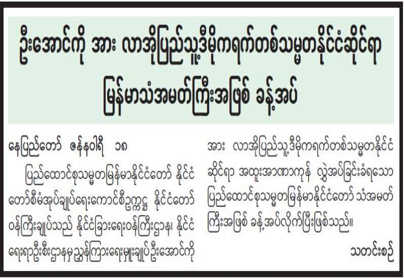 ပြည်ထောင်စုရွေးကောက်ပွဲကော်မရှင်အနေဖြင့် ပါတီစုံဒီမိုကရေစီအထွေထွေရွေးကောက်ပွဲ ကျင်းပရန်အတွက် ကြိုတင်ပြင်ဆင်မှုလုပ်ငန်းများ ဆောင်ရွက်လျက်ရှိရာ ပြည်ထောင်စုရွေးကောက်ပွဲကော်မရှင်ဥက္ကဋ္ဌ ဦးသိန်းစိုးသည် ကော်မရှင်အဖွဲ့ဝင်များ လိုက်ပါလျက် ယနေ့နံနက် ၁၀း၀၀ နာရီအချိန်က မန္တလေးတိုင်းဒေသကြီး၊ အောင်မြေသာစံမြို့နယ် အမှတ် (၁) အခြေခံပညာအထက်တန်းကျောင်း၌ ကျင်းပပြုလုပ်သည့် မြန်မာအီလက်ထရောနစ်မဲပေးစက်ဖြင့် လက်တွေ့စမ်းသပ်မဲပေးနေမှုကို ကြည့်ရှုစစ်ဆေးသည်။