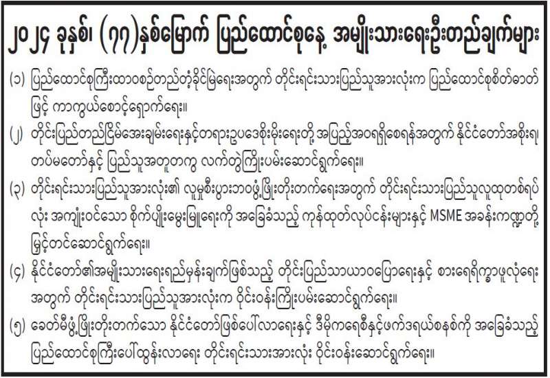 ကျောက်ဖြူအထူးစီးပွားရေးဇုန် ရေနက်ဆိပ်ကမ်းစီမံကိန်း အကောင်အထည်ဖော်ရေးအတွက် မြန်မာနိုင်ငံဘက်မှ ကြိုတင်ဖြည့်ဆည်းဆောင်ရွက်ရမည့် အခြေခံအဆောက်အအုံ ဆိုင်ရာလုပ်ငန်းများ Implementation Plan နှင့် စပ်လျဉ်းသည့် လုပ်ငန်းညှိနှိုင်း အစည်းအဝေးကို ယနေ့နံနက် ၁၀ နာရီက စီးပွားရေးနှင့်ကူးသန်းရောင်းဝယ်ရေးဝန်ကြီးဌာန၊ အစည်းအဝေးခန်းမ၌ ကျင်းပသည်။