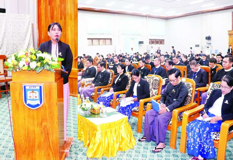 နိုင်ငံတကာအဆင့်မီ စာချုပ်စာတမ်းများ ချုပ်ဆိုခြင်းဆိုင်ရာ သင်တန်းဖွင့်ပွဲကို ယနေ့နံနက် ၉ နာရီခွဲတွင် ဥပဒေရေးရာဝန်ကြီးဌာနရှိ မြေညီထပ်အစည်းအဝေးခန်းမ၌ကျင်းပရာ ပြည်ထောင်စုဝန်ကြီးနှင့် ပြည်ထောင်စုရှေ့နေချုပ် ဒေါက်တာသီတာဦး၊ ဒုတိယဝန်ကြီးနှင့် ဒုတိယရှေ့နေချုပ်၊ ညွှန်ကြားရေးမှူးချုပ်များ၊ ဒုတိယညွှန်ကြားရေးမှူးချုပ်များ၊ ညွှန်ကြားရေးမှူးများနှင့် မိတ်ဖက်ဥပဒေအဖွဲ့အစည်းမှ ဥပဒေပညာရှင်များ တက်ရောက်ခဲ့ကြသည်။