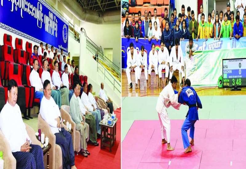 “၂၀၂၃-၂၀၂၄ ခုနှစ် ပြည်နယ်နှင့်တိုင်းဒေသကြီး ဂျူဒိုပြိုင်ပွဲ” ဗိုလ်လုပွဲနှင့်ဆုချီးမြှင့်ပွဲ အခမ်းအနားကို ယနေ့မွန်းလွဲပိုင်းက နေပြည်တော်ရှိဝဏ္ဏသိဒ္ဓိအားကစားရုံ (A) ၌ကျင်းပရာ နိုင်ငံတော်စီမံအုပ်ချုပ်ရေးကောင်စီအဖွဲ့ဝင်များဖြစ်ကြသည့် ပိုးရယ်အောင်သိန်း၊ ဒေါက်တာဘရွှေ၊ ခွန်စံလွင်၊ ဦးရွှေကြိမ်းနှင့် ဦးရန်ကျော်၊ ပြည်ထောင်စုဝန်ကြီးများ၊ ဒုတိယဝန်ကြီးများ၊ ဌာနဆိုင်ရာတာဝန်ရှိသူများ၊ မြန်မာနိုင်ငံဂျူဒိုအဖွဲ့ချုပ်ဥက္ကဋ္ဌနှင့် တာဝန်ရှိသူများ၊ ပြိုင်ပွဲဝင်အသင်းများမှ အုပ်ချုပ်သူ/ နည်းပြများနှင့် အားကစားသမားများ တက်ရောက်ကြသည်။