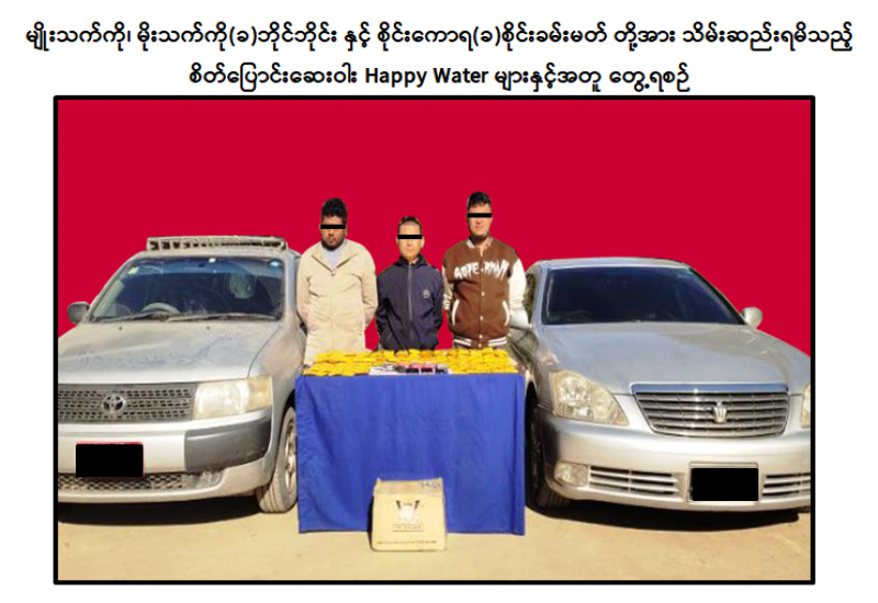 ဇန်နဝါရီလ ၆ ရက်နေ့ ၀၈:၃၀ အချိန် မူးယစ်ဆေးဝါးတားဆီးနှိမ်နင်းရေးရဲတပ်ဖွဲ့မှ တပ်ဖွဲ့ဝင်များ ပါဝင်သော ပူးပေါင်းအဖွဲ့သည် ကွန်ဟိန်းမြို့နယ်၊ တာကော်ကျေးရွာရှိ ပူးပေါင်းစစ်ဆေးရေးဂိတ်တွင် မျိုးသက်ကို မောင်းနှင်လာသည့် Probox အမျိုးအစား မော်တော်ယာဉ်ကို ရပ်တန့်စစ်ဆေးရှာဖွေရာ ယာဉ်နောက်ခန်းရှိ စက္ကူဂျပ်ဖာအတွင်းမှ စိတ်ပြောင်းဆေးဝါး Happy Water ၅ ဒသမ ၉၅ ကီလို သိမ်းဆည်းရမိခဲ့ပြီး ကွင်းဆက်အရ ၁၄၁၅ အချိန် စိတ်ပြောင်းဆေးဝါးများ သယ်ဆောင်ရာ၌ ပူးပေါင်းပါဝင်သူများဖြစ်သည့် စိုင်းကောရ(ခ)စိုင်းခမ်းမတ်အား နမ့်စန်မြို့အဝင်၊ နမ့်စန်-ခိုလမ်သွား ကားလမ်းတွင် TOYOTA CROWN မော်တော်ယာဉ် ၁ စီး၊