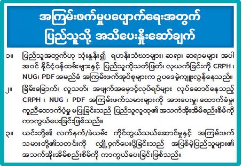အကြမ်းဖက်အုပ်စုအဖြစ် ကြေညာထားသော CRPH၊ NUG နှင့် ယင်းတို့၏ လက်ဝေခံအဖွဲ့အစည်းများ၊ ယင်းတို့နှင့် ဆက်နွှယ်နေသော အဖွဲ့အစည်းများ၊ လူပုဂ္ဂိုလ်များသည် နိုင်ငံတော်တည်ငြိမ်အေးချမ်းရေးကို ပျက်ပြားစေရန်နှင့် ပြည်သူလူထုကို အကြောက်တရားများ ဖြစ်ပေါ် စေပြီး အစိုးရယန္တရားများ ပျက်ပြားစေရန်ရည်ရွယ်လျက် လှုံ့ဆော်ခြင်း၊ ဝါဒဖြန့်ခြင်း၊ ခြိမ်းခြောက်ခြင်းများကို လူမှုကွန်ရက်များမှတစ်ဆင့်နည်းမျိုးစုံဖြင့် ပြုလုပ်လျက်ရှိသည်။