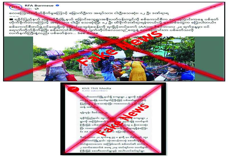 ရခိုင်ပြည်နယ်၊ ပေါက်တောမြို့ကို တပ်မတော်က လက်နက်ကြီးဖြင့် ပစ်ခတ်ခြင်းကြောင့် နေအိမ်များမီးလောင်နေပြီး ရမ်းဗြဲမြို့ရှိ နေအိမ်များကိုလည်း တပ်မတော်က မီးရှို့ဖျက်ဆီးနေကြောင်း တရားမဝင်မီဒီယာတစ်ခုဖြစ်သည့် Khit Thit Media က သတင်းတု၊ သတင်းအမှားများကို လူမှုကွန်ရက်စာမျက်နှာပေါ်တွင် ရေးသားဖြန့်ဝေလျက်ရှိသည်ကို တွေ့ရှိရသည်။