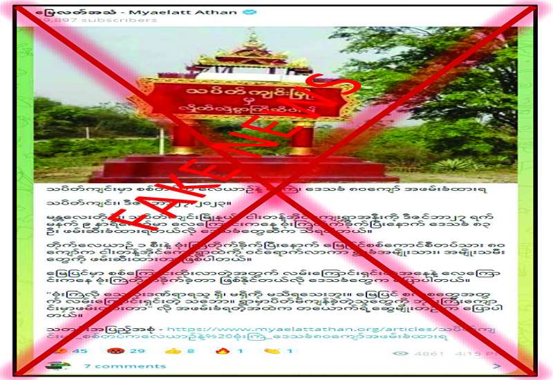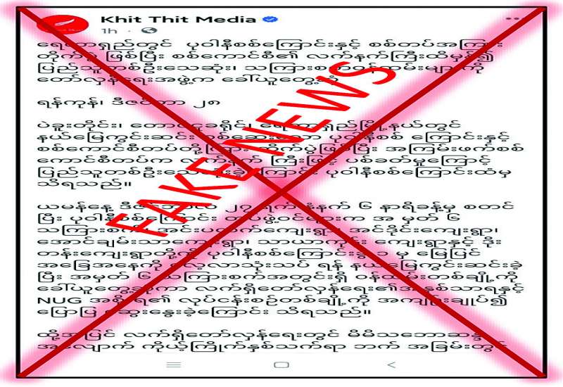 ပဲခူးတိုင်းဒေသကြီး ကျောက်တံခါးမြို့နယ် ပျဉ်းမပင်ရွာကို ဒီဇင်ဘာ ၂၇ ရက်က တပ်မတော်က လက်နက်ကြီးပစ်ခတ်မှုကြောင့် ပြည်သူတစ်ဦး သေဆုံးပြီး သုံးဦး ထိခိုက်ဒဏ်ရာရရှိခဲ့ကြောင်းနှင့် ရေတာရှည်မြို့နယ် သာယာကုန်းကျေးရွာနှင့် ဒိုးတန်းကျေးရွာများတွင် အကြမ်းဖက်သောင်းကျန်းသူများနှင့် လုံခြုံရေးတပ်ဖွဲ့ဝင်များ တိုက်ပွဲဖြစ်ပွားခဲ့ပြီး လုံခြုံရေးတပ်ဖွဲ့ဝင်များက ကျေးရွာများအတွင်းသို့ လက်နက်ကြီးများပစ်ခတ်ခဲ့မှုကြောင့် ပြည်သူတစ်ဦး သေဆုံးခဲ့ကြောင်း မဟုတ်မမှန် သတင်းတု၊ သတင်းအမှားများကို Khit Thit Media က လူမှုကွန်ရက်စာမျက်နှာများတွင် ရေးသားဖြန့်ဝေလျက်ရှိသည်ကို တွေ့ရှိရသည်။