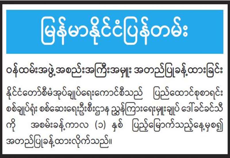 နိုင်ငံတော်စီမံအုပ်ချုပ်ရေးကောင်စီသည် ပြည်ထောင်စုစာရင်းစစ်ချုပ်ရုံး စစ်ဆေးရေးဦးစီးဌာန ညွှန်ကြားရေးမှူးချုပ် ဒေါ်ခင်ခင်သီကို အစမ်းခန့်ကာလ (၁)နှစ် ပြည့်မြောက်သည့်နေ့မှစ၍ အတည်ပြုခန့်ထားလိုက်သည်။