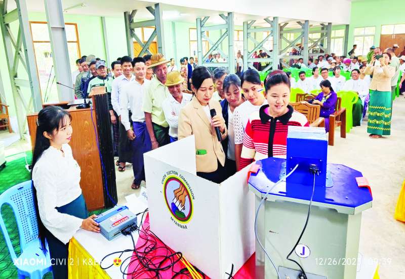 ရန်ကုန်တိုင်းဒေသကြီး နယ်မြေမဲဆန္ဒရှင်ပြည်သူများ၏ မြန်မာအီလက်ထရောနစ်မဲပေးစက်ဖြင့် လက်တွေ့စမ်းသပ်မဲပေးလေ့လာခြင်းကို ဒီဇင်ဘာ ၄ ရက်မှစတင်၍ ခရိုင်နယ်မြေများအလိုက် ဆောင်ရွက်လျက်ရှိရာ ယနေ့တွင် တိုက်ကြီးမြို့နယ် ရပ်/ကျေး ၄၈ ခုမှ ပြည်သူ ၅၁၈ ဦး၊ မြောက်ဥက္ကလာပမြို့နယ် ရပ်ကွက်ကိုးခုမှ ပြည်သူ ၄၉၀၊ ကော့မှူးမြို့နယ် ရပ်/ကျေး ၂၃ ခုမှ ပြည်သူ ၆၄၀၊ စမ်းချောင်းမြို့နယ် ရပ်ကွက် ၁၀ ခုမှ ပြည်သူ ၄၆၁ ဦး စုစုပေါင်းပြည်သူ ၂၁၀၉ ဦးတက်ရောက်၍ လက်တွေ့စမ်းသပ်မဲပေးလေ့လာမှုများ ဆောင်ရွက်ကြသည်။