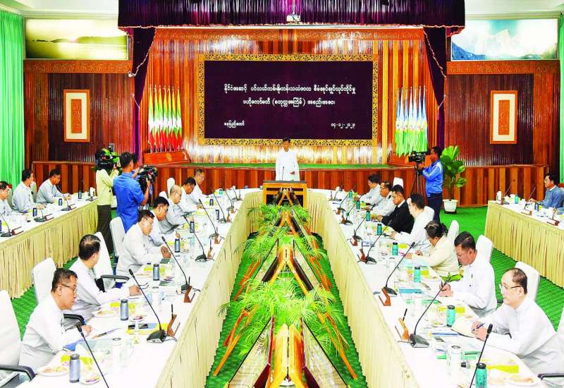 တရားမဝင်ကုန်သွယ်မှုတိုက်ဖျက်ရေး ဦးဆောင်ကော်မတီ လုပ်ငန်းညှိနှိုင်းအစည်းအဝေး (၆/၂၀၂၃) ကို ယနေ့မွန်းလွဲပိုင်းတွင် နေပြည်တော်ရှိ စီးပွားရေးနှင့် ကူးသန်းရောင်းဝယ်ရေးဝန်ကြီးဌာန ညီလာခံခန်းမ၌ကျင်းပရာ တရားမဝင်ကုန်သွယ်မှုတိုက်ဖျက်ရေး ဦးဆောင်ကော်မတီဥက္ကဋ္ဌ နိုင်ငံတော်စီမံအုပ်ချုပ်ရေးကောင်စီ ဒုတိယဥက္ကဋ္ဌ ဒုတိယဝန်ကြီးချုပ် ဒုတိယဗိုလ်ချုပ်မှူးကြီးစိုးဝင်း တက်ရောက်အမှာစကားပြောကြားသည်။