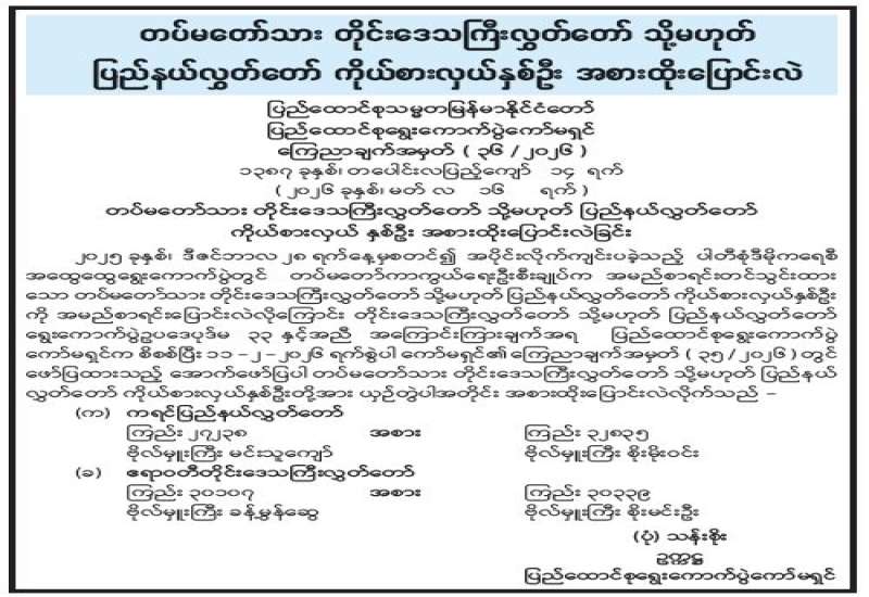 တပ်မတော်သား တိုင်းဒေသကြီးလွှတ်တော် သို့မဟုတ် ပြည်နယ်လွှတ်တော် ကိုယ်စားလှယ်နှစ်ဦး အစားထိုးပြောင်းလဲ