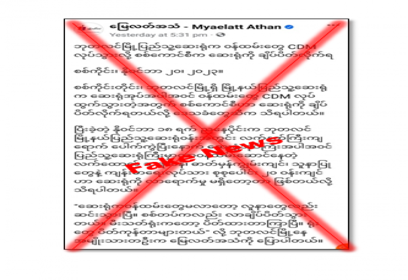 စစ်ကိုင်းတိုင်းဒသကြီး၊ ဘုတလင်မြို့ပြည်သူ့ဆေးရုံ၌ တာဝန်ထမ်းဆောင်လျက်ရှိသည့် ကျန်းမာရေးဝန်ထမ်းများအားလုံး CDM ပြုလုပ်သွားသဖြင့် တပ်မတော်မှအဆိုပါဆေးရုံအား ချိတ်ပိတ်လိုက်ကြောင်း Social Media များ၌ သတင်းမှားများ ဖြန့်ဝေလျက်ရှိသည်။