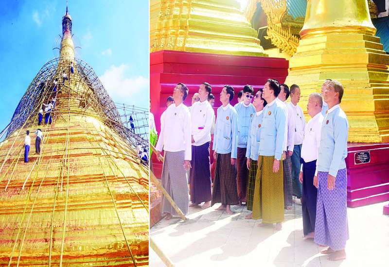 သာသနာရေးနှင့်ယဉ်ကျေးမှုဝန်ကြီးဌာန ပြည်ထောင်စုဝန်ကြီး ဦးတင်ဦးလွင်သည် တာဝန်ရှိသူများနှင့်အတူ ယနေ့နံနက်ပိုင်းက ရွှေတိဂုံစေတီတော် ရင်ပြင်ရှိ နောင်တော်ကြီးစေတီတော်အား လုံးတော်ပြည့် ရွှေသင်္ကန်းဆက်ကပ်လှူဒါန်းရန် ပြင်ဆင်ထားမှုနှင့် ငြမ်းဆင်ခြင်းလုပ်ငန်းများ ဆောင်ရွက်နေမှုကို သွားရောက်ကြည့်ရှု စစ်ဆေးသည်။