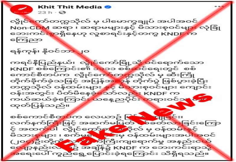 KNPP အဖွဲ့နှင့် PDF အမည်ခံ အကြမ်းဖက်အဖွဲ့များသည် နိုဝင်ဘာ ၁၃ ရက်နှင့် ၁၄ ရက်တို့တွင် စစ်ရေးနှင့်မသက်ဆိုင်သည့် ကယားပြည်နယ်၊ လွိုင်ကော်တက္ကသိုလ်အား လက်နက်ကြီး၊ လက်နက်ငယ်များဖြင့် ရည်ရွယ်ချက်ရှိရှိ လာရောက်ပစ်ခတ် တိုက်ခိုက်ခဲ့ပြီး အေးချမ်းစွာ ပညာသင်ကြားလျက်ရှိသည့် ပါမောက္ခချုပ် အပါအဝင် ဆရာ၊ဆရာမများ၊ မိသားစုဝင်များကို ၎င်းတို့အနေဖြင့် အတင်းအဓမ္မ ဖမ်းဆီးခေါ်ဆောင်ခဲ့ပြီးနောက် လူမှုကွန်ရက် စာမျက်နှာများ မှတစ်ဆင့် မဟုတ်မမှန် ဝါဒဖြန့် သတင်းများ ထုတ်ပြန်လျက်ရှိသည်ကို တွေ့ရှိရသည်။