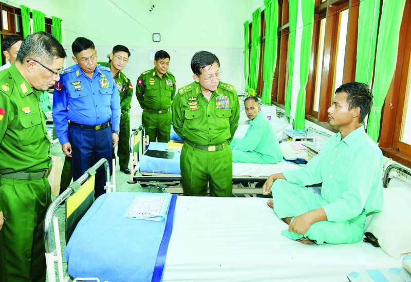 နိုင်ငံတော်စီမံအုပ်ချုပ်ရေးကောင်စီ ဥက္ကဋ္ဌ တပ်မတော်ကာကွယ်ရေးဦးစီးချုပ် ဗိုလ်ချုပ်မှူးကြီး မင်းအောင်လှိုင် သည် ညှိနှိုင်းကွပ်ကဲရေးမှူး (ကြည်း၊ရေ၊လေ) ဗိုလ်ချုပ်ကြီး မောင်မောင်အေး၊ ကာကွယ်ရေးဦးစီးချုပ်(ရေ) ဗိုလ်ချုပ်ကြီး မိုးအောင်၊ ကာကွယ်ရေးဦးစီးချုပ် (လေ) ဗိုလ်ချုပ်ကြီး ထွန်းအောင်နှင့် တပ်မတော်အရာရှိကြီးများ လိုက်ပါ၍ ယနေ့နေ့လယ်ပိုင်းတွင် နေပြည်တော်၊ တပ်မတော်ဆေးရုံကုတင် (၁၀၀၀)ရှိ အရိုးရောဂါနှင့် ထိခိုက်ဒဏ်ရာကုသမှုဌာန၌ တက်ရောက်ကုသမှုခံယူလျက်ရှိသည့် နိုင်ငံတော်ကာကွယ်ရေးနှင့် လုံခြုံရေးတာဝန်များ ထမ်းဆောင်စဉ် ထိခိုက်ဒဏ်ရာရရှိခဲ့သော အရာရှိ၊ စစ်သည်များအား သွားရောက်ကြည့်ရှုအားပေး စကားပြောကြားသည်။