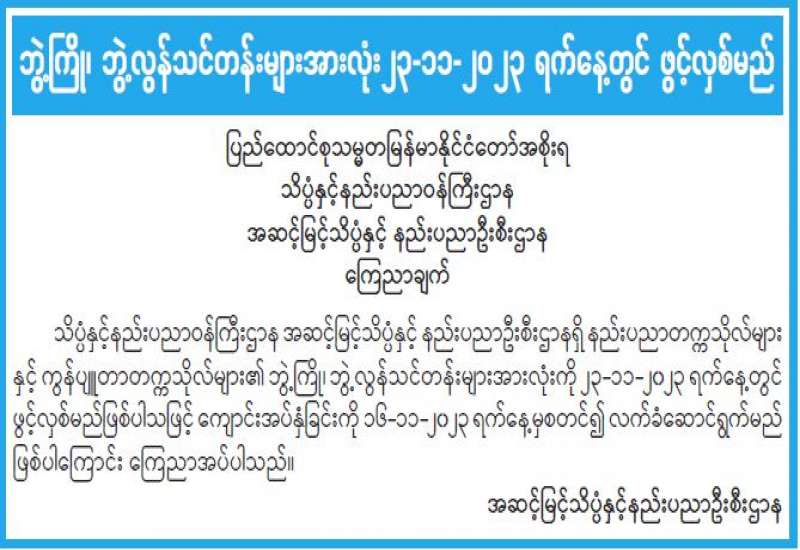 ဘွဲ့ကြို၊ ဘွဲ့လွန်သင်တန်းများအားလုံး၂၃-၁၁-၂၀၂၃ ရက်နေ့တွင် ဖွင့်လှစ်မည်