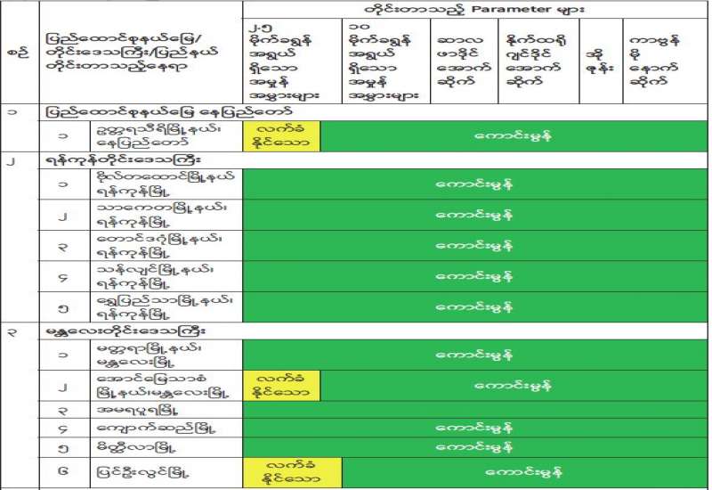 မြန်မာနိုင်ငံတစ်ဝန်းရှိ ဝန်းကျင်လေထုအရည်အသွေးအခြေအနေအား လေ့လာဆန်းစစ်နိုင်ရန်အတွက် ပတ်ဝန်းကျင်ထိန်းသိမ်းရေးဦးစီးဌာနအနေဖြင့် ပြည်ထောင်စုနယ်မြေ/ တိုင်းဒေသကြီး/ ပြည်နယ်များရှိ သတ်မှတ် Sampling Point နေရာများတွင် ဝန်းကျင်လေထုအရည်အသွေးကို Environmental Perimeter Air Station (EPAS) - Haz-Scanner ၊ Air Quality Monitoring Station (AQM-65) ၊ Scentroid (SL– 50 Scential) ၊ Aeroqual (Series – 500 Portable Air Quality Monitor)၊ AQMesh (Dust Analyzer - 1941150)၊ (Gas Analyzer - 1940150)၊ Portable Beta Attenuation Mass Monitor (BAM 1022)၊ Air Quality Monitoring Station (AQMS) နှင့် Continuous Particulate Monitor များအသုံးပြု၍ Particulate Matter 2.5 (PM2.5) ၊ Particulate Matter 10 (PM10) ၊ Sulphur Dioxide (SO2) ၊ Nitrogen Dioxide (NO2)၊ Ozone (O3) နှင့် Carbon Monoxide (CO) စသည့် အဓိက Parameter များကို ပုံမှန်တိုင်းတာပြီး လေ့လာ ဆန်းစစ်လျက်ရှိပါသည်။