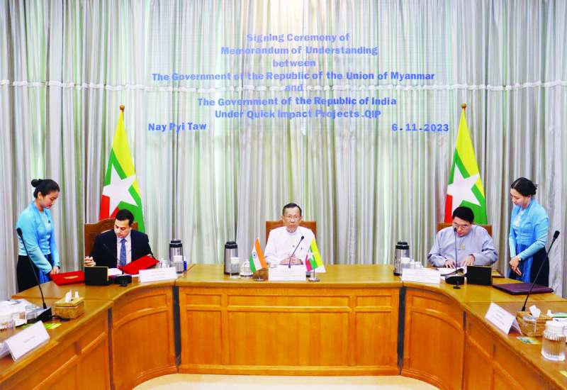 ပြည်ထောင်စုသမ္မတမြန်မာနိုင်ငံတော် အစိုးရနှင့် အိန္ဒိယသမ္မတနိုင်ငံ အစိုးရတို့အကြား “မြန်ဆန်စွာ အကျိုးဖြစ်ထွန်းစေမည့် စီမံချက်များ (Quick Impact Projects-QIP)” အကောင်အထည်ဖော်ဆောင်ရွက်ရန် နားလည်မှုစာချွန်လွှာ ၃ စောင် လက်မှတ်ရေးထိုးပွဲ အခမ်းအနားကို ယနေ့နံနက်ပိုင်းတွင် နေပြည်တော်ရှိ ရင်းနှီးမြှုပ်နှံမှုနှင့်နိုင်ငံခြား စီးပွားဆက်သွယ်ရေးဝန်ကြီးဌာန၌ ကျင်းပသည်။