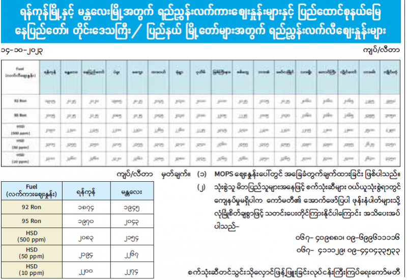 ရန်ကုန်မြို့နှင့် မန္တလေးမြို့အတွက် ရည်ညွှန်းလက်ကားဈေးနှုန်းများနှင့် ပြည်ထောင်စုနယ်မြေ နေပြည်တော်၊ တိုင်းဒေသကြီး/ ပြည်နယ် မြို့တော်များအတွက် ရည်ညွှန်းလက်လီဈေးနှုန်းများ