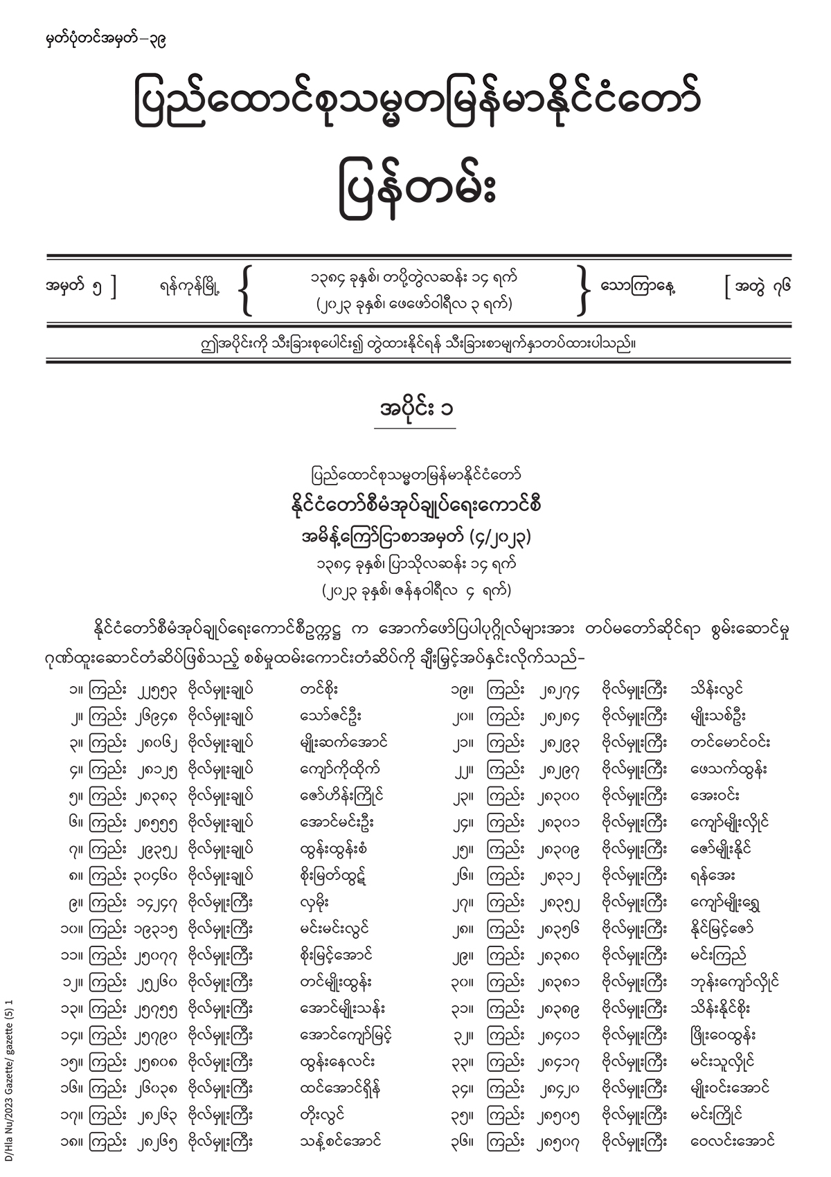 ပြည်ထောင်စုသမ္မတ မြန်မာနိုင်ငံတော်ပြန်တမ်းများကို ပြန်ကြားရေးဝန်ကြီးဌာန ပုံနှိပ်ရေးနှင့်ထုတ်ဝေရေး ဦးစီးဌာနက ထုတ်ဝေဖြန့်ချိလျက်ရှိရာ ၂၀၂၃ ခုနှစ်၊ ဖေဖော်ဝါရီလ (၃) ရက်ထုတ် အတွဲ (၇၆) ၊ အမှတ် (၅) ပြန်တမ်းစာစောင်ကို စာပေဗိမာန်စာအုပ် အရောင်းဆိုင်များမှတစ်ဆင့် စတင်ဖြန့်ချိ ရောင်းချလျက်ရှိပြီ ဖြစ်ပါသည်။ ယခုတစ်ပတ်ထုတ် မြန်မာနိုင်ငံတော်ပြန်တမ်းတွင် အပိုင်း (၁) ၊ အပိုင်း (၂) နှင့် အပိုင်း (၄)တို့ ပါရှိပါသည်။