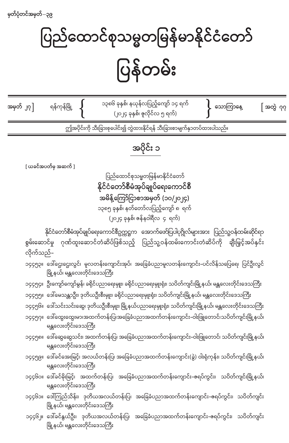 အမိန့်ကြော်ငြာစာ၊ ဆောက်လုပ်ရေးဝန်ကြီးဌာန အမိန့်ကြော်ငြာစာ၊ ဟိုတယ်နှင့် ခရီးသွားလာရေး ဝန်ကြီးဌာန (ဝန်ကြီးရုံး) အမိန့်ကြော်ငြာစာတို့ ပါဝင်ပါသည်။