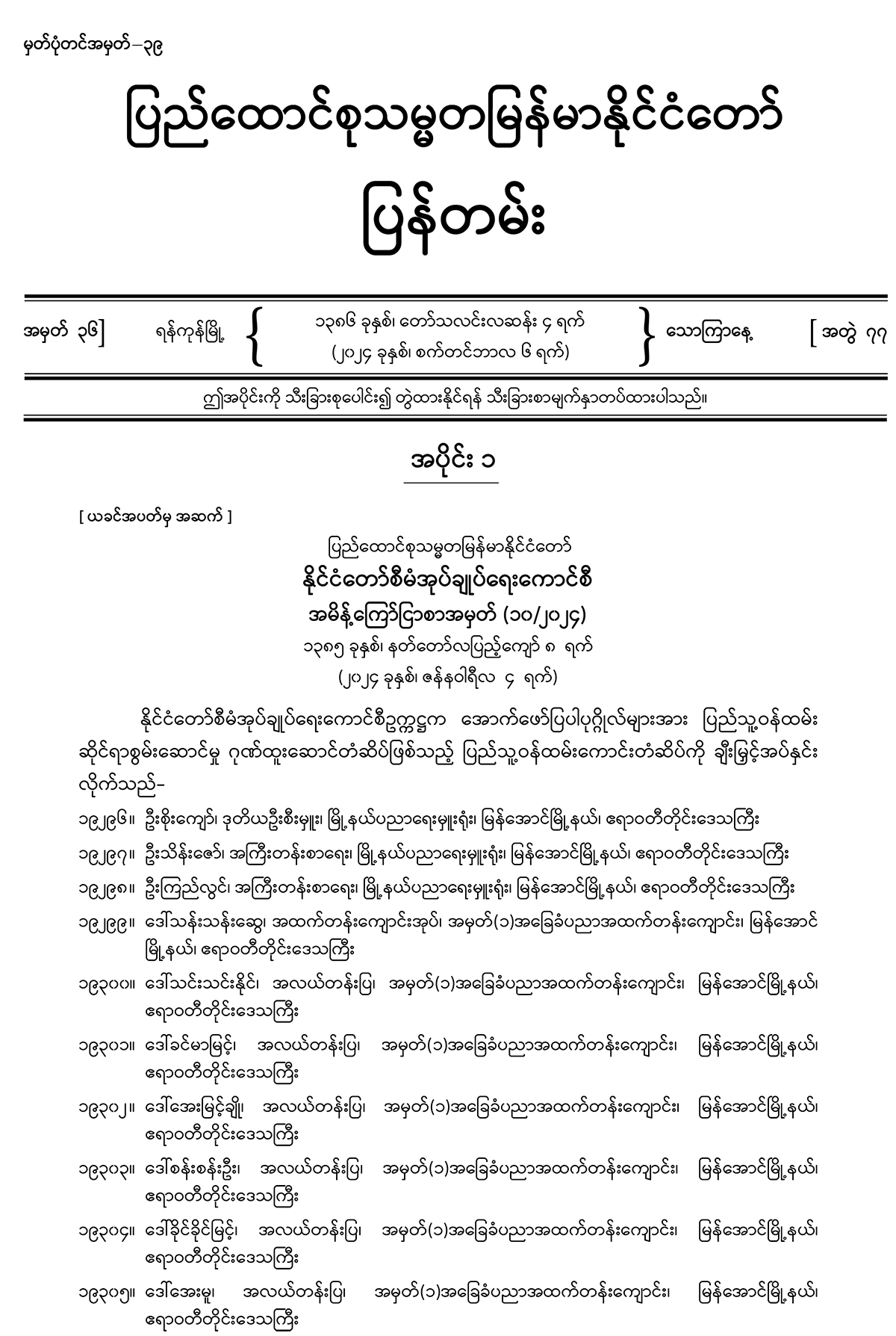 အပိုင်း (၁) တွင် နိုင်ငံတော်စီမံအုပ်ချုပ်ရေးကောင်စီ အမိန့်ကြော်ငြာစာ၊ ခရီးသွားလုပ်ငန်း ကော်မတီ အမိန့်ကြော်ငြာစာ၊ (၂၅) ကြိမ်မြောက် ငွေရတုအထိမ်းအမှတ် မြန်မာ့ရိုးရာယဉ်ကျေးမှု အဆို၊ အက၊ အရေး၊ အတီး ပြိုင်ပွဲကျင်းပရေးလုပ်ငန်းကော်မတီ အမိန့်ကြော်ငြာစာ၊ ပို့ဆောင်ရေး နှင့် ဆက်သွယ်ရေးဝန်ကြီးဌာန (ဝန်ကြီးရုံး) အမိန့်ကြော်ငြာစာ၊ ပြည်ထဲရေးဝန်ကြီးဌာန (ဝန်ကြီးရုံး) အမိန့်ကြော်ငြာစာ၊ စီမံကိန်းနှင့် ဘဏ္ဍာရေးဝန်ကြီးဌာန အမိန့်ကြော်ငြာစာ၊ သာသနာရေးနှင့် ယဉ်ကျေးမှုဝန်ကြီးဌာန (ဝန်ကြီးရုံး) အမိန့်ကြော်ငြာစာ၊ စိုက်ပျိုးရေး၊ မွေးမြူရေး နှင့် ဆည်မြောင်းဝန်ကြီးဌာန (ပြည်ထောင်စုဝန်ကြီးရုံး) အမိန့်ကြော်ငြာစာ၊ သယံဇာတနှင့် သဘာဝပတ်ဝန်းကျင်ထိန်းသိမ်းရေးဝန်ကြီးဌာန (ပြည်ထောင်စုဝန်ကြီးရုံး) အမိန့်ကြော်ငြာစာ၊ စီးပွားရေးနှင့် ကူးသန်းရောင်းဝယ်ရေးဝန်ကြီးဌာန (ပြည်ထောင်စုဝန်ကြီးရုံး) အမိန့်ကြော်ငြာစာ၊ ပညာရေးဝန်ကြီးဌာန (ဝန်ကြီးရုံး) အမိန့်ကြော်ငြာစာ၊ သိပ္ပံနှင့် နည်းပညာဝန်ကြီးဌာန (ဝန်ကြီးရုံး) အမိန့်ကြော်ငြာစာ၊ ဆောက်လုပ်ရေးဝန်ကြီးဌာန (ပြည်ထောင်စုဝန်ကြီးရုံး) အမိန့်ကြော်ငြာစာ၊ လူမှုဝန်ထမ်း၊ ကယ်ဆယ်ရေးနှင့် ပြန်လည်နေရာချထားရေးဝန်ကြီးဌာန (ဝန်ကြီးရုံး) အမိန့် ကြော်ငြာစာ၊ ဟိုတယ်နှင့်ခရီးသွားလာရေးဝန်ကြီးဌာန (ဝန်ကြီးရုံး) အမိန့်ကြော်ငြာစာ၊ ရန်ကုန် တိုင်းဒေသကြီးအစိုးရအဖွဲ့ ရန်ကုန်မြို့တော်စည်ပင်သာယာရေးကော်မတီ အမိန့်ကြော်ငြာစာတို့ ပါဝင်ပါသည်။
