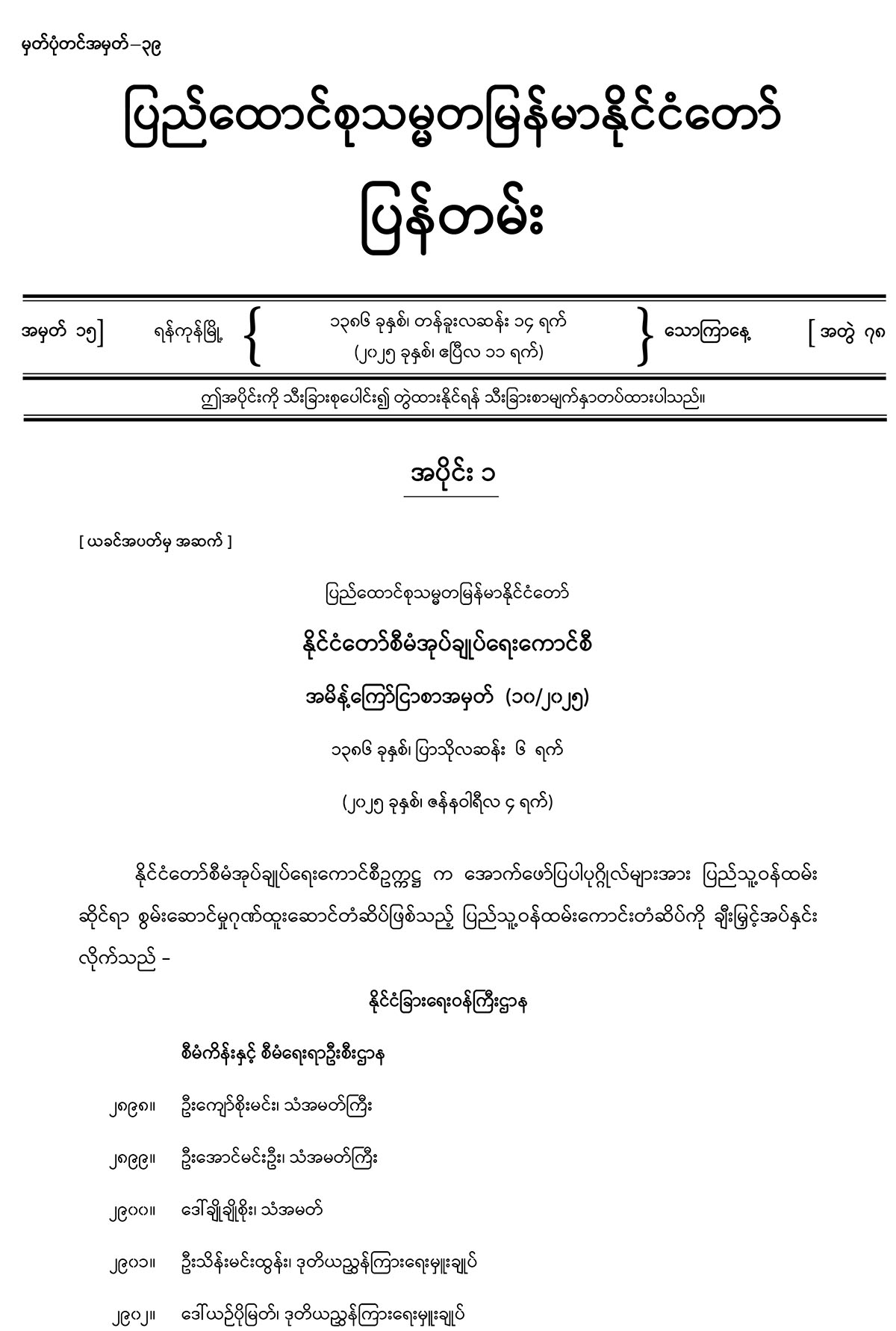 အပိုင်း (၁) တွင် နိုင်ငံတော်စီမံအုပ်ချုပ်ရေးကောင်စီ အမိန့်ကြော်ငြာစာ၊ ပြည်ထောင်စု တရားလွှတ်တော်ချုပ် အမိန့်ကြော်ငြာစာ၊ ပြည်ထောင်စုရွေးကောက်ပွဲကော်မရှင် အမိန့် ကြော်ငြာစာ၊ လူမှုကာကွယ်စောင့်ရှောက်ရေးဆိုင်ရာ အမျိုးသားကော်မတီ အမိန့်ကြော်ငြာ စာ၊ ပို့ဆောင်ရေးနှင့် ဆက်သွယ်ရေးဝန်ကြီးဌာန (ဝန်ကြီးရုံး) အမိန့်ကြော်ငြာစာ၊ ပြည်ထဲရေးဝန်ကြီးဌာန (ဝန်ကြီးရုံး) အမိန့်ကြော်ငြာစာ၊ စီမံကိန်းနှင့် ဘဏ္ဍာရေးဝန်ကြီးဌာန အမိန့်ကြော်ငြာစာ၊ ပြန်ကြားရေးဝန်ကြီးဌာန အမိန့်ကြော်ငြာစာ၊ သာသနာရေးနှင့် ယဉ်ကျေးမှုဝန်ကြီးဌာန (ဝန်ကြီးရုံး) အမိန့်ကြော်ငြာစာ၊ သယံဇာတနှင့် သဘာဝ ပတ်ဝန်းကျင်ထိန်းသိမ်းရေးဝန်ကြီးဌာန အမိန့်ကြော်ငြာစာ၊ လျှပ်စစ်စွမ်းအားဝန်ကြီးဌာန အမိန့်ကြော်ငြာစာ၊ စက်မှုဝန်ကြီးဌာန အမိန့်ကြော်ငြာစာ၊ အလုပ်သမားဝန်ကြီးဌာန အမိန့်ကြော်ငြာစာ၊ စီးပွားရေးနှင့် ကူးသန်းရောင်းဝယ်ရေးဝန်ကြီးဌာန (ပြည်ထောင်စု ဝန်ကြီးရုံး) အမိန့်ကြော်ငြာစာ၊ ပညာရေးဝန်ကြီးဌာန (ဝန်ကြီးရုံး) အမိန့်ကြော်ငြာစာ၊ ကျန်းမာရေးဝန်ကြီးဌာန အမိန့်ကြော်ငြာစာ၊ မြန်မာနိုင်ငံတော်ဗဟိုဘဏ် အမိန့်ကြော်ငြာစာ တို့ ပါဝင်ပါသည်။