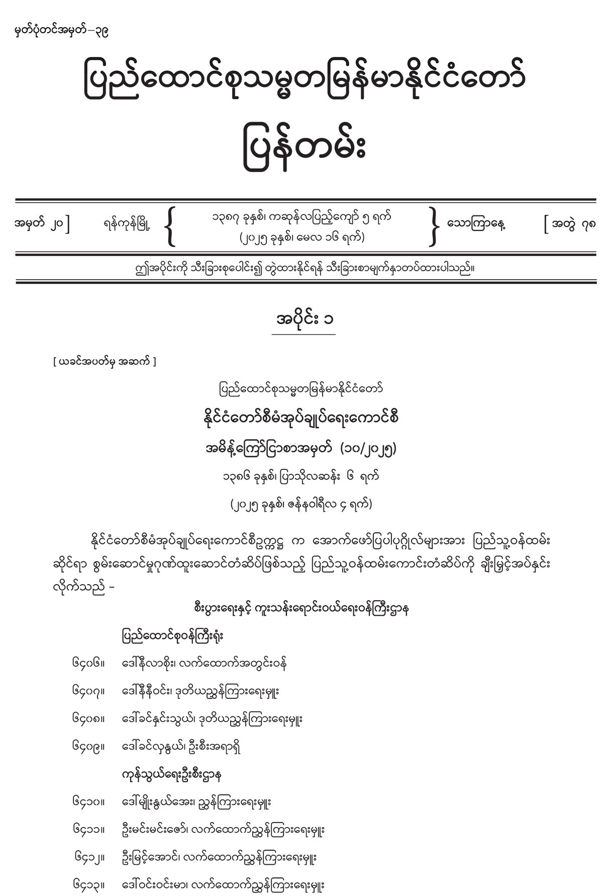 အပိုင်း (၁) တွင် နိုင်ငံတော်စီမံအုပ်ချုပ်ရေးကောင်စီ အမိန့်ကြော်ငြာစာ၊ ပြည်ထောင်စု တရားလွှတ်တော်ချုပ် အမိန့်ကြော်ငြာစာ၊ အဂတိလိုက်စားမှုတိုက်ဖျက်ရေးကော်မရှင် အမိန့် ကြော်ငြာစာ၊ မြန်မာနိုင်ငံစားသုံးသူကာကွယ်ရေးကော်မရှင် အမိန့်ကြော်ငြာစာ၊ မြေလွတ်၊ မြေလပ်နှင့် မြေရိုင်းများစီမံခန့်ခွဲရေးဗဟိုကော်မတီ အမိန့်ကြော်ငြာစာ၊ ပြည်ထဲရေး ဝန်ကြီးဌာန (ဝန်ကြီးရုံး) အမိန့်ကြော်ငြာစာ၊ ပြန်ကြားရေးဝန်ကြီးဌာန (ဝန်ကြီးရုံး) အမိန့် ကြော်ငြာစာ၊ သာသနာရေးနှင့် ယဉ်ကျေးမှုဝန်ကြီးဌာန အမိန့်ကြော်ငြာစာ၊ စိုက်ပျိုးရေး၊ မွေးမြူရေးနှင့် ဆည်မြောင်းဝန်ကြီးဌာန (ပြည်ထောင်စုဝန်ကြီးရုံး) အမိန့်ကြော်ငြာစာ၊ စက်မှုဝန်ကြီးဌာန အမိန့်ကြော်ငြာစာ၊ စီးပွားရေးနှင့် ကူးသန်းရောင်းဝယ်ရေးဝန်ကြီးဌာန (ပြည်ထောင်စုဝန်ကြီးရုံး) အမိန့်ကြော်ငြာစာ၊ ဆောက်လုပ်ရေးဝန်ကြီးဌာန (ပြည်ထောင်စု ဝန်ကြီးရုံး) အမိန့်ကြော်ငြာစာ၊ ဟိုတယ်နှင့် ခရီးသွားလာရေးဝန်ကြီးဌာန (ဝန်ကြီးရုံး) အမိန့်ကြော်ငြာစာတို့ ပါဝင်ပါသည်။