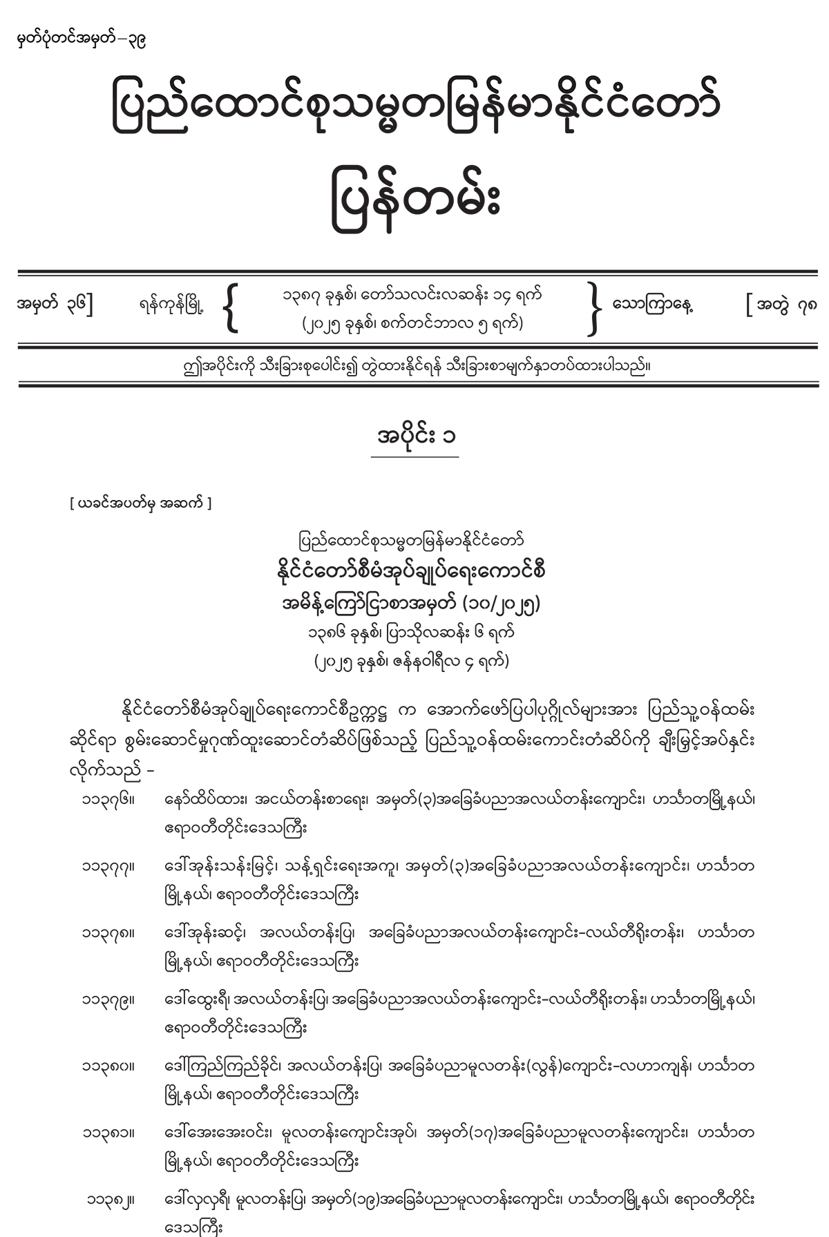 အပိုင်း (၁) တွင် နိုင်ငံတော်စီမံအုပ်ချုပ်ရေးကောင်စီ အမိန့်ကြော်ငြာစာ၊ အမျိုးသား ကာကွယ်ရေး နှင့် လုံခြုံရေးကောင်စီရုံး အမိန့်ကြော်ငြာစာ၊ ပြည်ထောင်စုအစိုးရအဖွဲ့ အမိန့်ကြော်ငြာစာ၊ အမျိုးသားအဆင့် လျှပ်စစ်သုံးယာဉ်နှင့် ဆက်စပ်လုပ်ငန်းများ ဖွံ့ဖြိုးတိုးတက်ရေး ဦးဆောင် ကော်မတီ အမိန့်ကြော်ငြာစာ၊ အမျိုးသားစီမံကိန်းဝန်ကြီးဌာန အမိန့်ကြော်ငြာစာ၊ ပို့ဆောင်ရေး နှင့် ဆက်သွယ်ရေးဝန်ကြီးဌာန (ဝန်ကြီးရုံး) အမိန့်ကြော်ငြာစာ၊ နိုင်ငံခြားရေးဝန်ကြီးဌာန အမိန့်ကြော်ငြာစာ၊ ပြည်ထဲရေးဝန်ကြီးဌာန (ဝန်ကြီးရုံး) အမိန့်ကြော်ငြာစာ၊ နယ်စပ်ရေးရာ ဝန်ကြီးဌာန (ဝန်ကြီးရုံး) အမိန့်ကြော်ငြာစာ၊ တိုင်းရင်းသားလူမျိုးများရေးရာဝန်ကြီးဌာန (ပြည် ထောင်စုဝန်ကြီးရုံး) အမိန့်ကြော်ငြာစာ၊ ပြန်ကြားရေးဝန်ကြီးဌာန အမိန့်ကြော်ငြာစာ၊ စိုက်ပျိုးရေး၊ မွေးမြူရေးနှင့် ဆည်မြောင်းဝန်ကြီးဌာန (ပြည်ထောင်စုဝန်ကြီးရုံး) အမိန့်ကြော်ငြာစာ၊ သယံဇာတ နှင့် သဘာဝပတ်ဝန်းကျင် ထိန်းသိမ်းရေးဝန်ကြီးဌာန (ပြည်ထောင်စုဝန်ကြီးရုံး) အမိန့် ကြော်ငြာစာ၊ အလုပ်သမားဝန်ကြီးဌာန အမိန့်ကြော်ငြာစာ၊ စီးပွားရေးနှင့် ကူးသန်းရောင်းဝယ်ရေး ဝန်ကြီးဌာန (ပြည်ထောင်စုဝန်ကြီးရုံး) အမိန့်ကြော်ငြာစာ၊ ပညာရေးဝန်ကြီးဌာန (ဝန်ကြီးရုံး) အမိန့်ကြော်ငြာစာ၊ ဆောက်လုပ်ရေးဝန်ကြီးဌာန အမိန့်ကြော်ငြာစာ၊ ပြည်ထောင်စုရာထူးဝန်အဖွဲ့ အမိန့်ကြော်ငြာစာ၊ နေပြည်တော်စည်ပင်သာယာရေးကော်မတီ အမိန့်ကြော်ငြာစာ၊ ရန်ကုန်တိုင်း ဒေသကြီးအစိုးရအဖွဲ့ ရန်ကုန်မြို့တော်စည်ပင်သာယာရေးကော်မတီ အမိန့်ကြော်ငြာစာတို့ ပါဝင်ပါသည်။